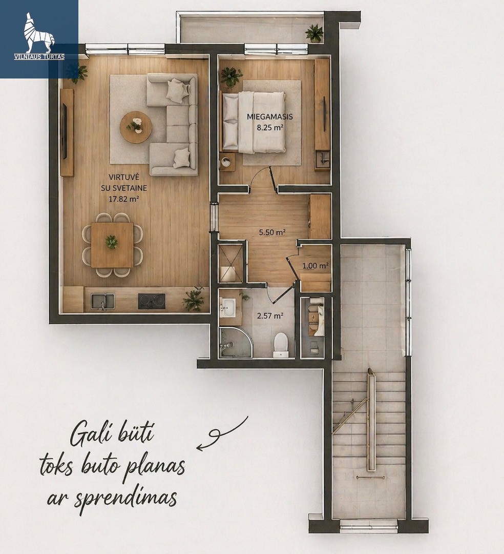 🛠️ Butas remontuotinas, todėl turite puikią galimybę viską įsirengti pagal savo skonį. Esama išplanavimo struktūra leidžia lengvai transformuoti būstą į 2 kambarių butą – įrengti miegamąjį virtuvės vietoje, o erdvią svetainę sujungti su virtuve.