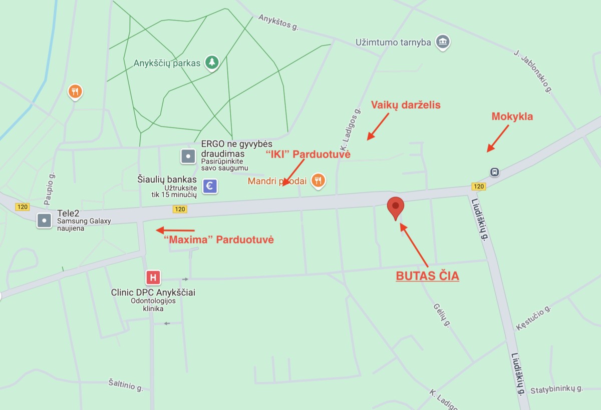 Namo lokacija – viena patogiausių Anykščių mieste. Rami vieta, bet visiškai centrinė – šalia parduotuvės, kavinės ir restoranai, paslaugų centrai – viskas pasiekiama pėsčiomis vos per kelias minutes. Netoliese Anykščių gamta ir pasivaikščiojimų takai. Šis šviesus ir saulėtas butas tai namai, į kuriuos gera grįžti ir dar maloniau juose būti kasdien.