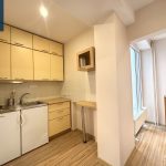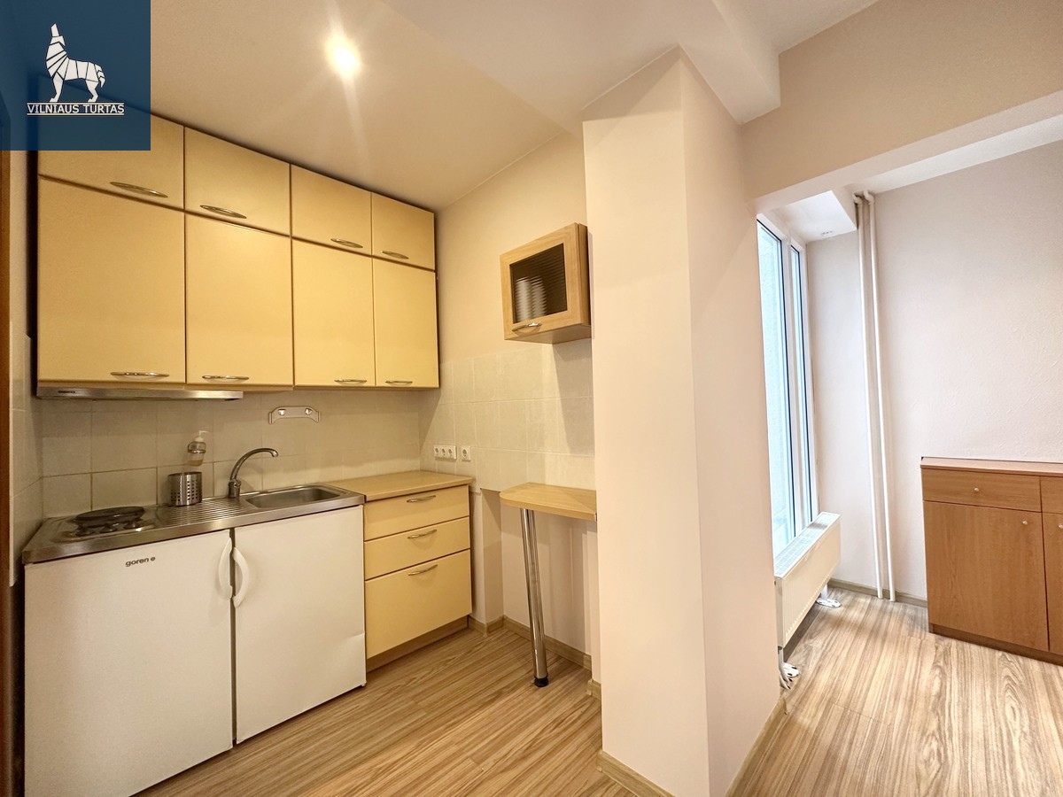 Virtuvė: virtuvės baldai, mažas šaldytuvas.