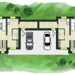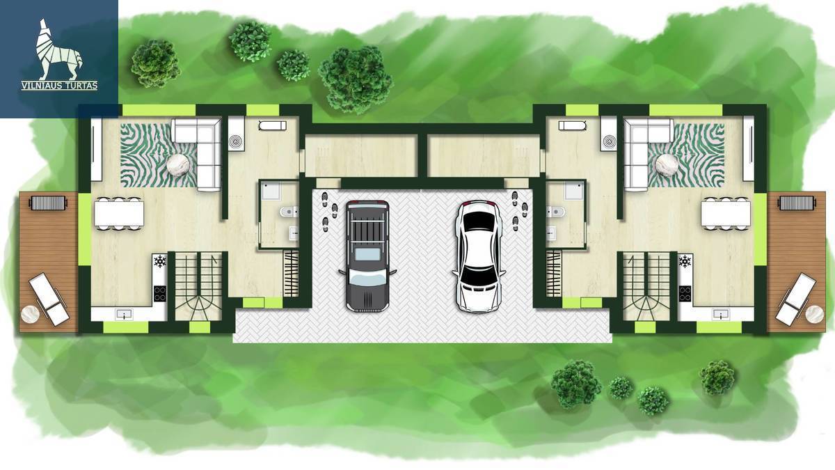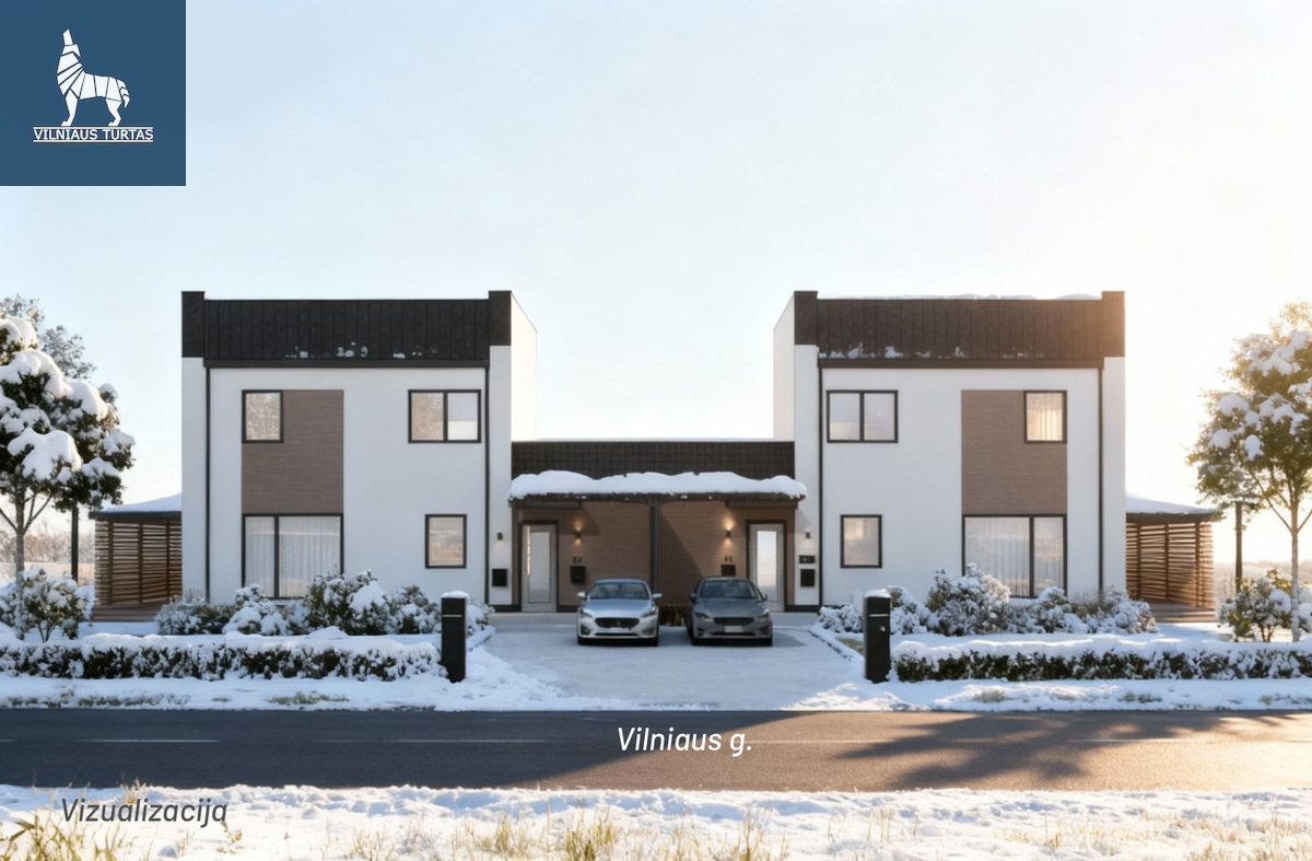 Projektas numato modernų dvibutį namą su stogine automobiliams, o visi dokumentai jau sutvarkyti – statybas galite pradėti iškart.
