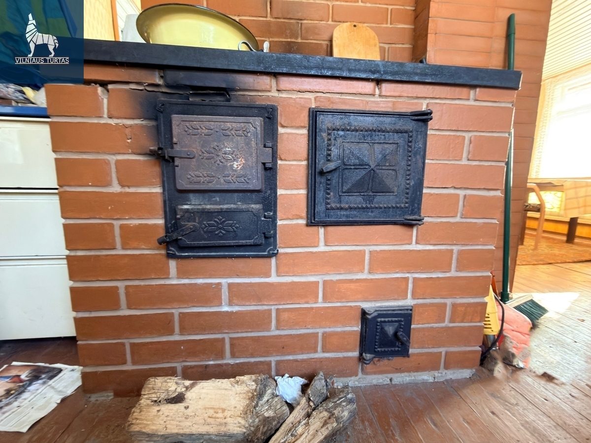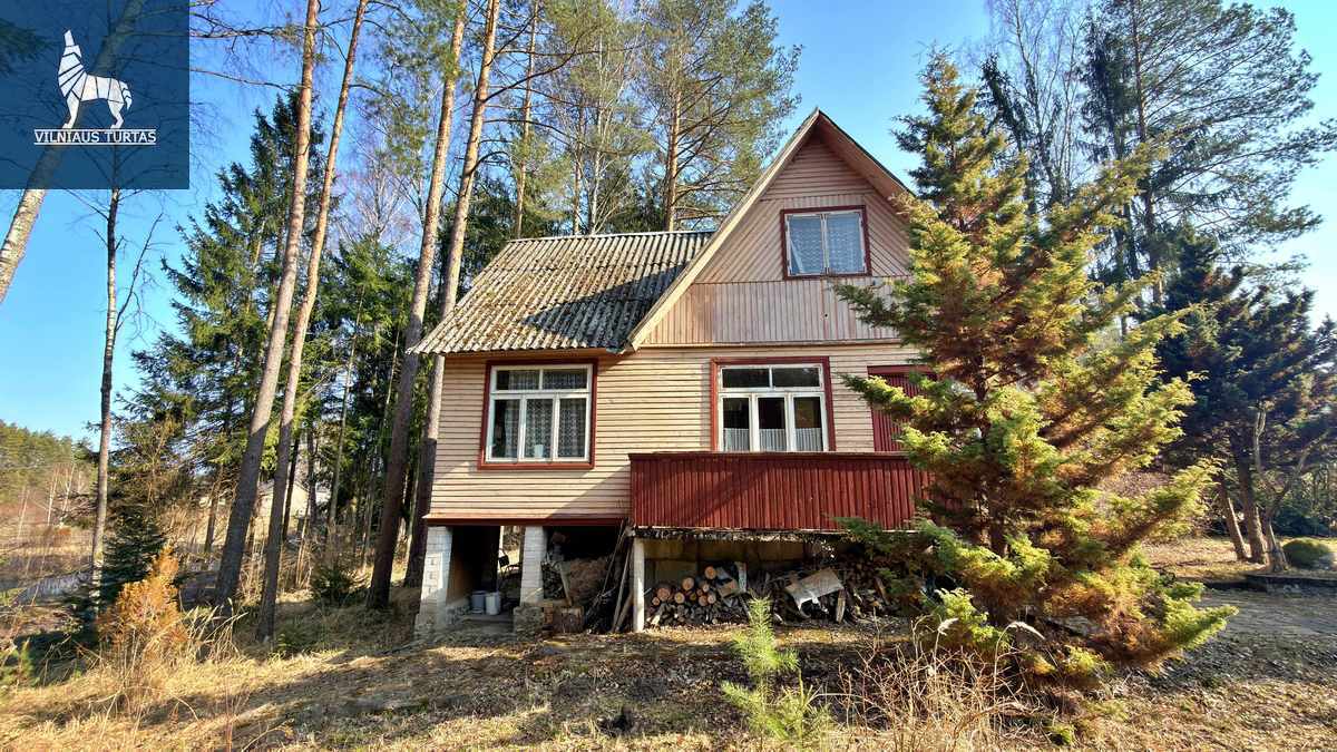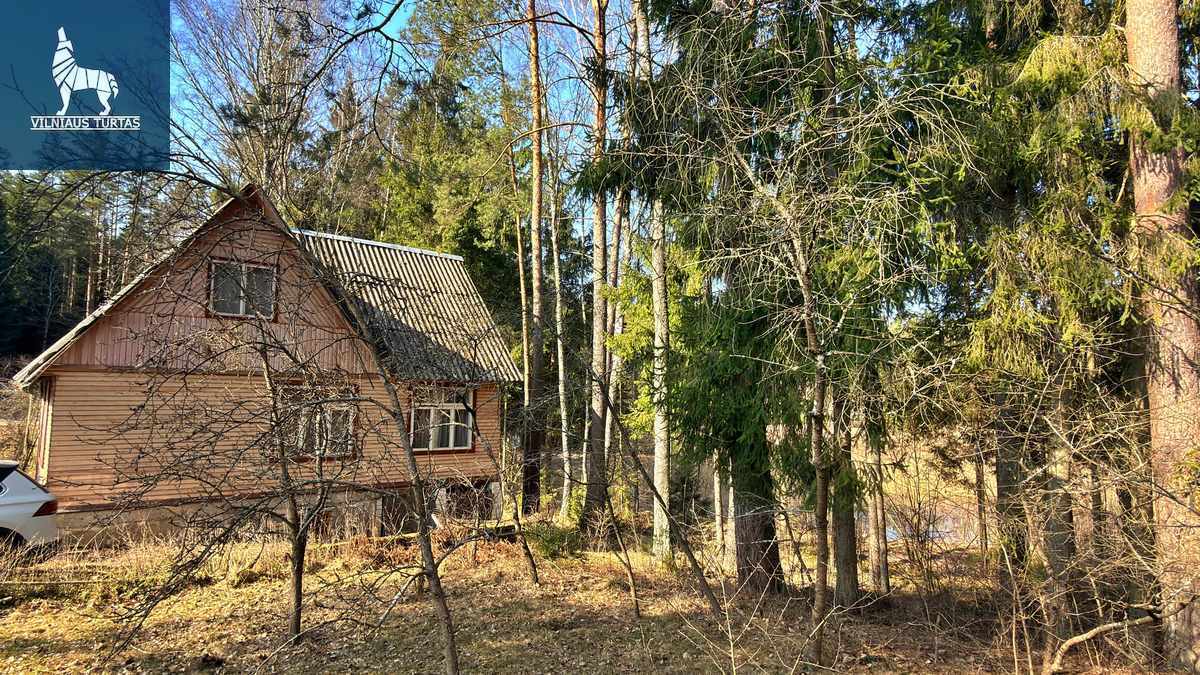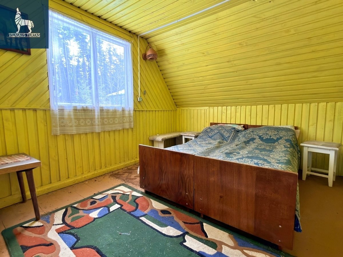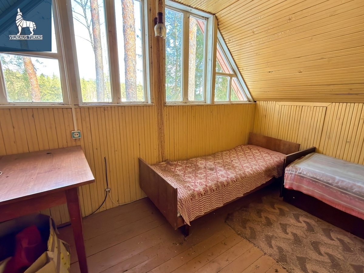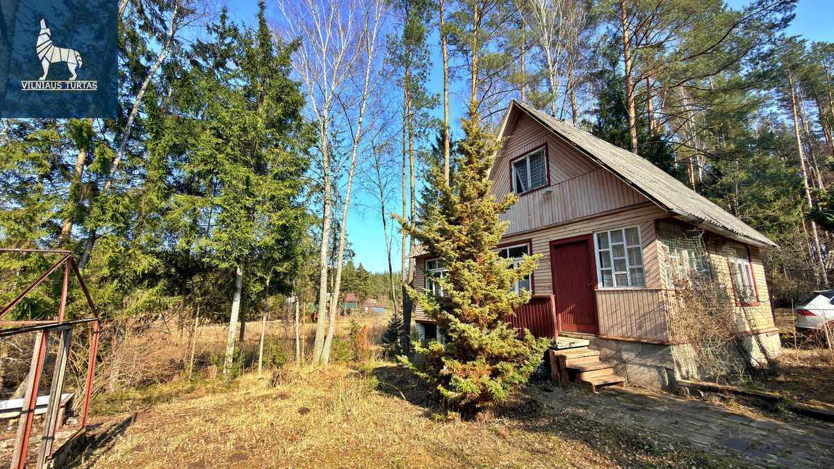 Pirmame aukšte įrengta virtuvė su mūrine krosnimi, kuri suteikia jaukumo ir šilumos, svetainė bei miegamasis. Mediniai laiptai veda į mansardinį aukštą, kuriame dar keli kambariai – patogu įrengti miegamuosius ar vaikų zoną. Vidus paprastas, tačiau šviesus ir prižiūrėtas, paliekantis daug galimybių atsinaujinti pagal savo skonį. Yra ūkinis pastatas daiktams, įrankiams ar dirbtuvėms. Aptverta teritorija suteikia privatumo ir saugumo jausmą. Netoliese teka šaltinis, o vaizdai pro langus – tarsi iš atviruko: miškas, pieva, tvenkinys ir keli kaimyniniai sodo nameliai.