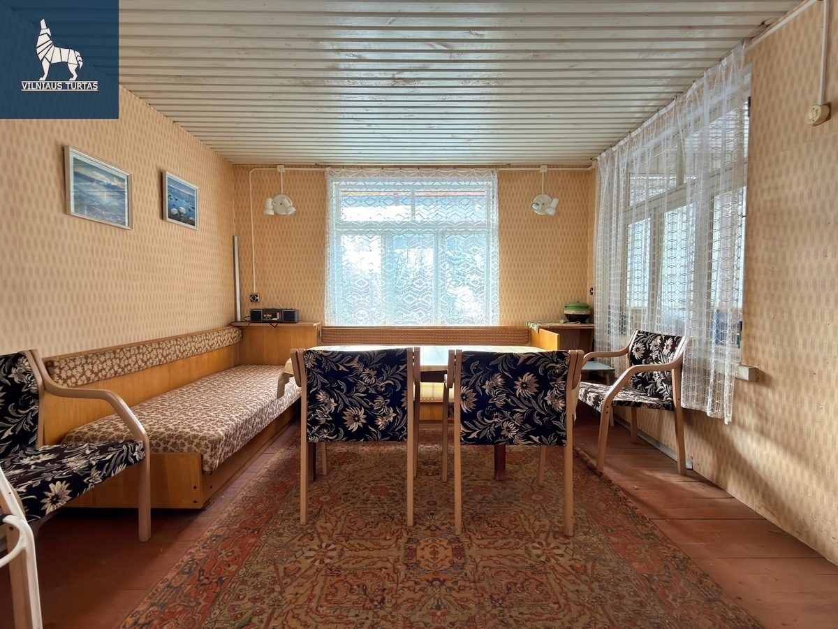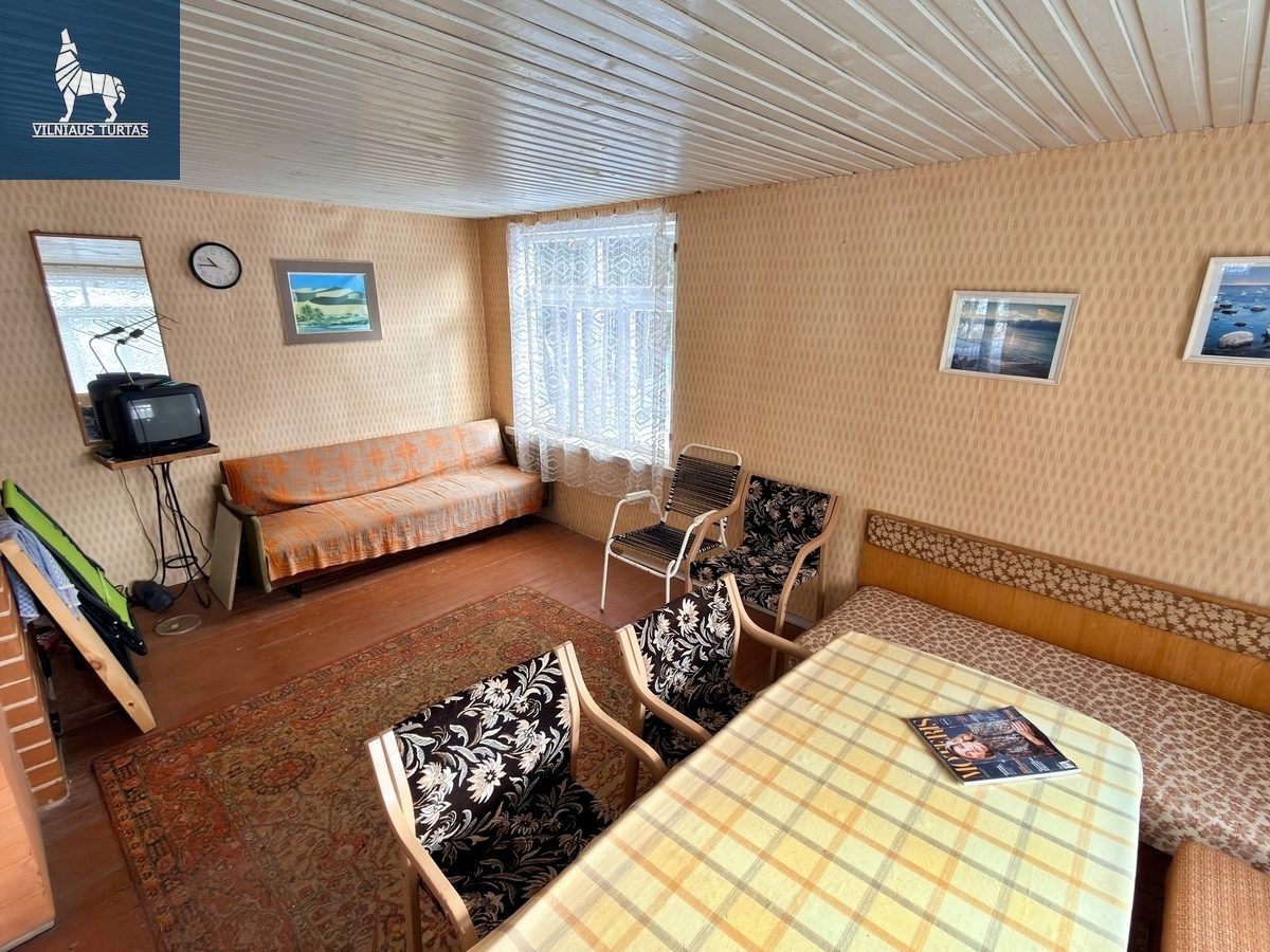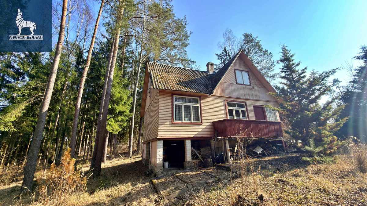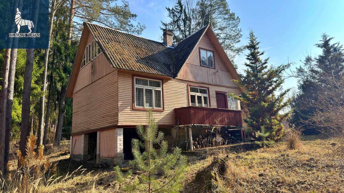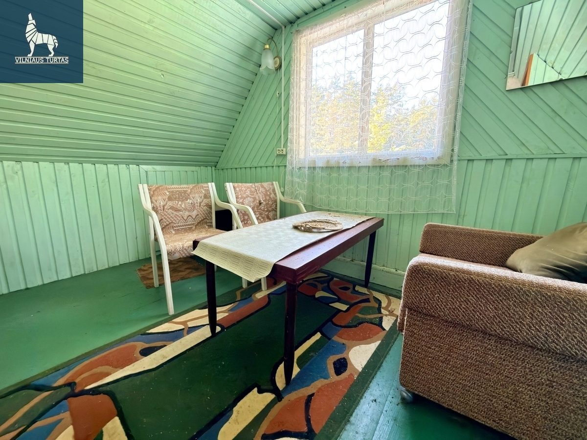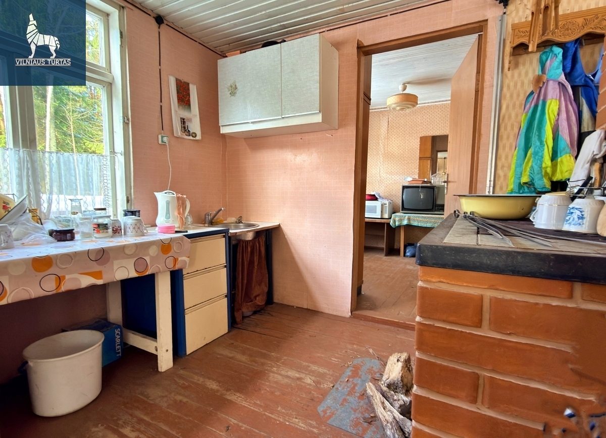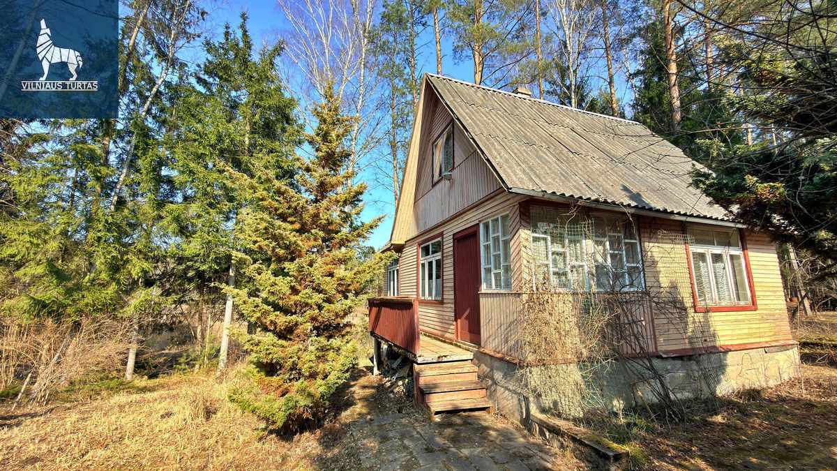 Pirmame aukšte įrengta virtuvė su mūrine krosnimi, kuri suteikia jaukumo ir šilumos, svetainė bei miegamasis. Mediniai laiptai veda į mansardinį aukštą, kuriame dar keli kambariai – patogu įrengti miegamuosius ar vaikų zoną. Vidus paprastas, tačiau šviesus ir prižiūrėtas, paliekantis daug galimybių atsinaujinti pagal savo skonį. Yra ūkinis pastatas daiktams, įrankiams ar dirbtuvėms. Aptverta teritorija suteikia privatumo ir saugumo jausmą. Netoliese teka šaltinis, o vaizdai pro langus – tarsi iš atviruko: miškas, pieva, tvenkinys ir keli kaimyniniai sodo nameliai.