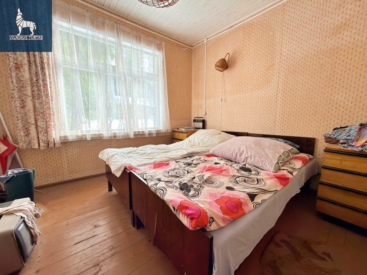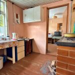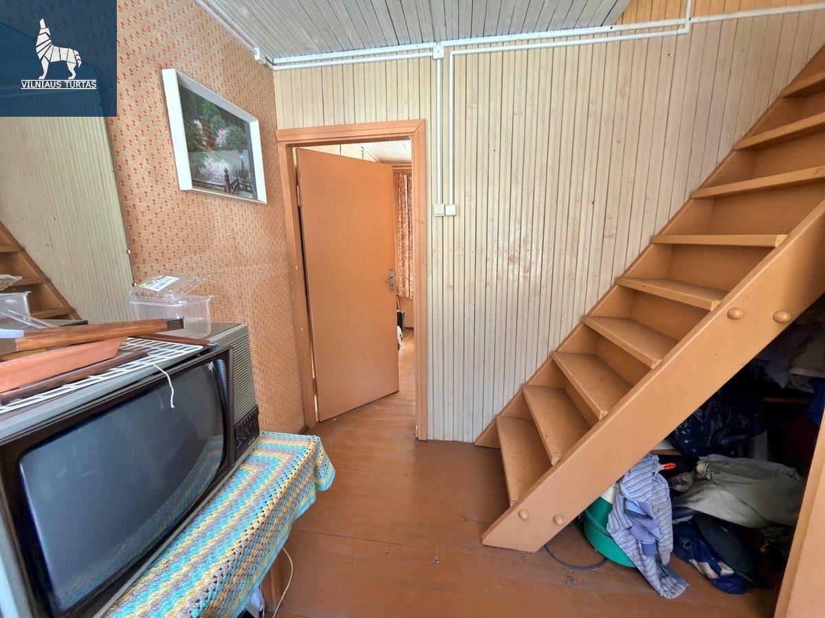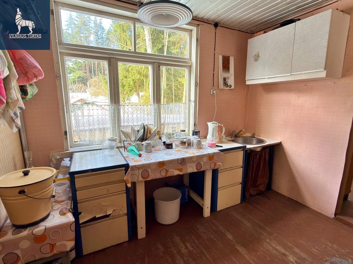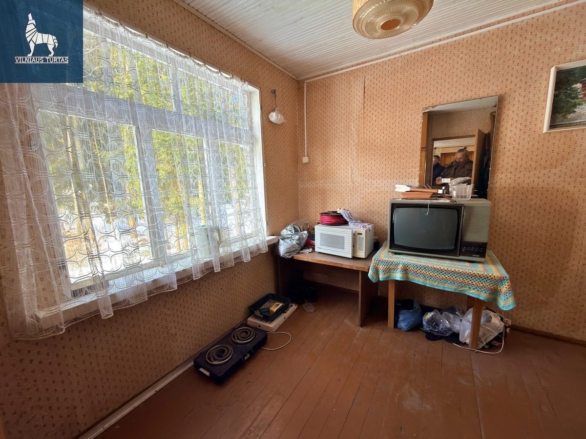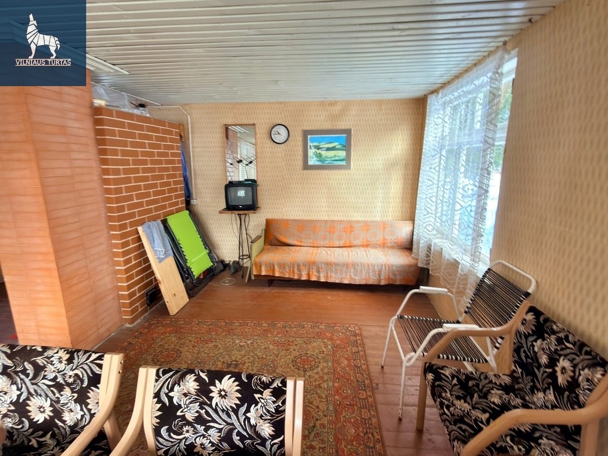 Pirmame aukšte įrengta virtuvė su mūrine krosnimi, kuri suteikia jaukumo ir šilumos, svetainė bei miegamasis. Mediniai laiptai veda į mansardinį aukštą, kuriame dar keli kambariai – patogu įrengti miegamuosius ar vaikų zoną. Vidus paprastas, tačiau šviesus ir prižiūrėtas, paliekantis daug galimybių atsinaujinti pagal savo skonį. Yra ūkinis pastatas daiktams, įrankiams ar dirbtuvėms. Aptverta teritorija suteikia privatumo ir saugumo jausmą. Netoliese teka šaltinis, o vaizdai pro langus – tarsi iš atviruko: miškas, pieva, tvenkinys ir keli kaimyniniai sodo nameliai.