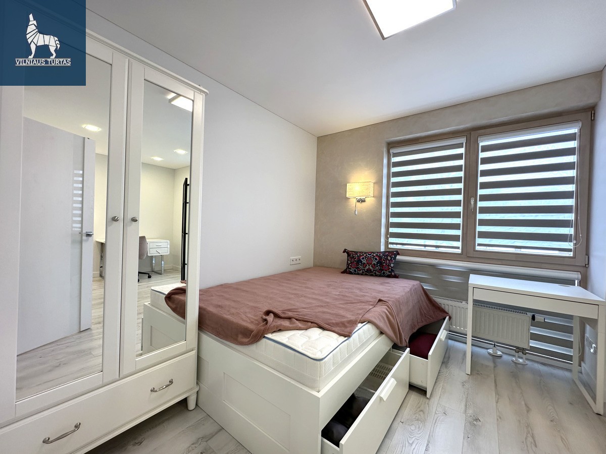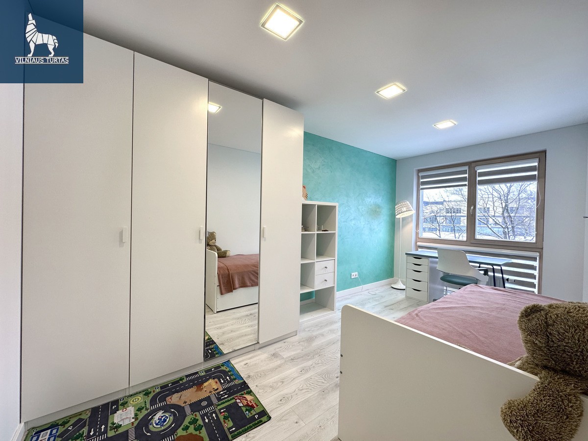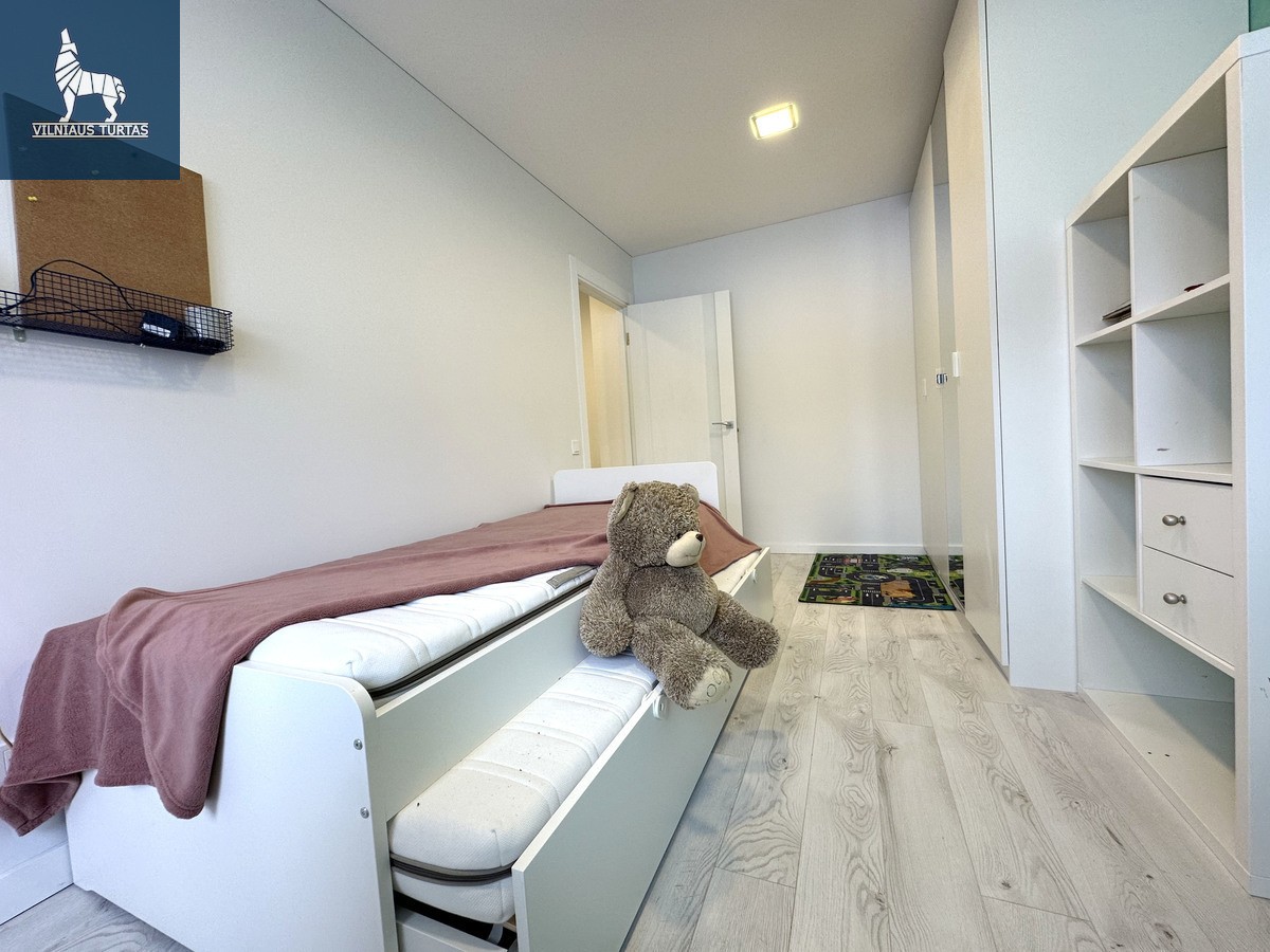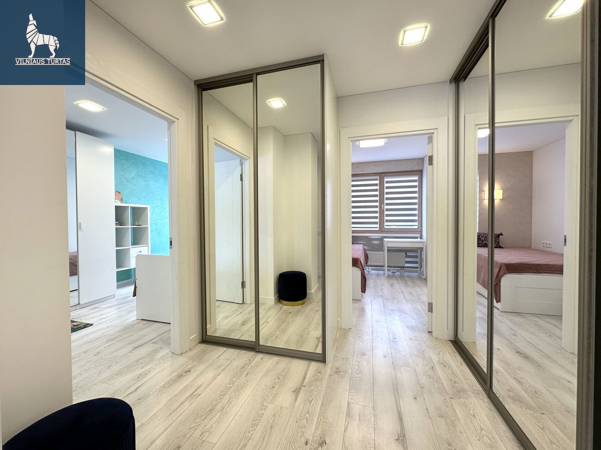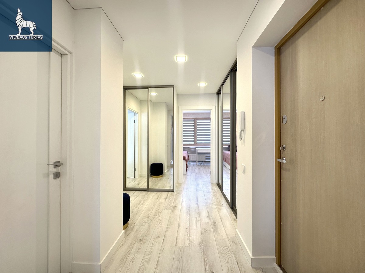 5 aukštas iš 7, bendras plota 69 kv.m., statyba 2021 m., mūrinis namas, didelis balkonas-lodžija, vonia ir tualetas kartu, du izoliuoti kambariai, svetainė kartu su virtuvė, bute didelės ir gerai apgalvotos spintos, daug apšvietimo, geros lovos su patogiais čiužiniais.
