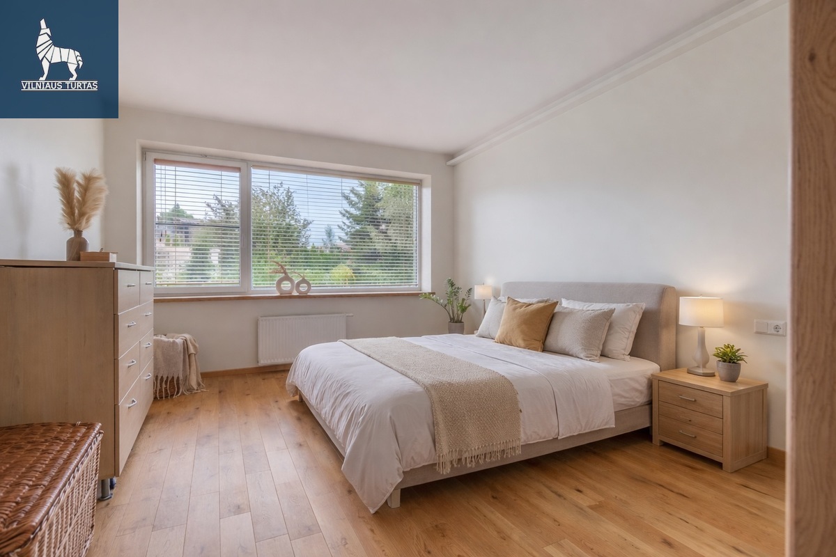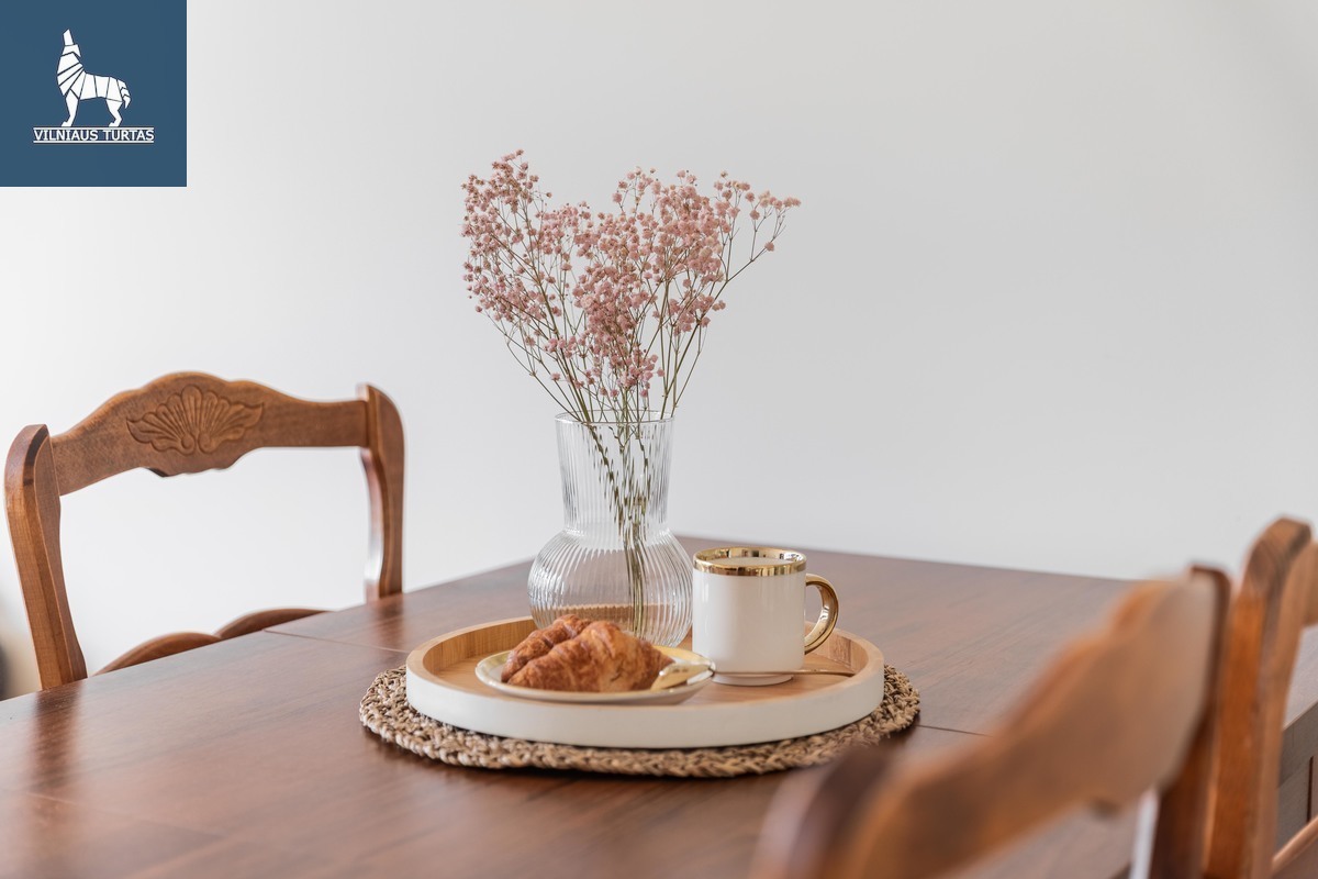 Interjere vyrauja šilti, ilgaamžiai sprendimai – natūralaus ąžuolo parketas, medinės palangės, mediniai stalviršiai, žaliuzės ir šviesi, rami spalvinė gama. Visa tai kuria ne momentinį įspūdį, o tikrą kokybės jausmą.