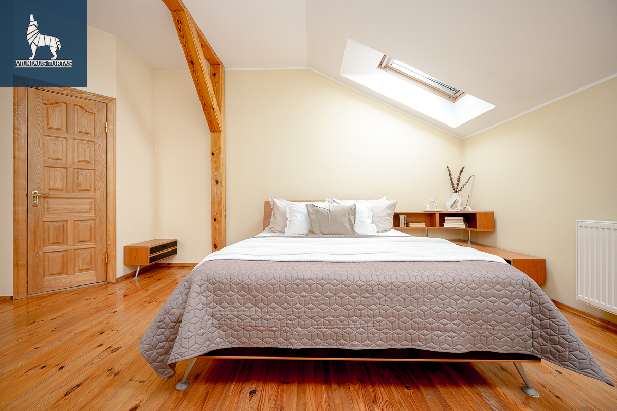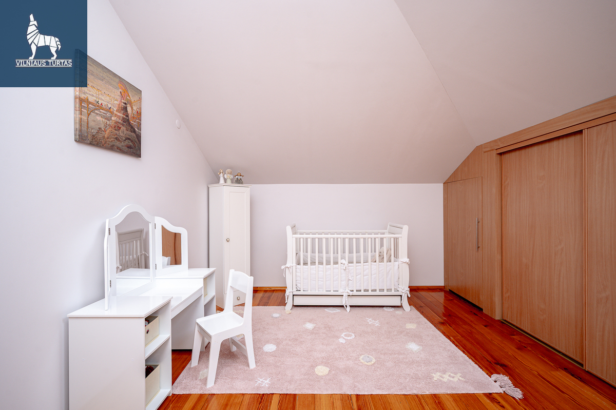 Antrame aukšte – privatūs miegamieji kambariai, užtikrinantys ramų poilsį. Rūsyje įrengtas garažas, pirtis su priešpirčiu – puiki vieta atsipalaiduoti po darbo dienos ar savaitgalį su artimaisiais.