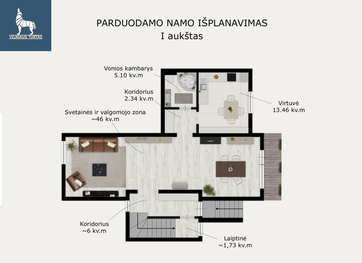 Namas dviejų aukštų, 4 kambarių, išplanavimas patogus ir funkcionalus. Pirmame aukšte – erdvi svetainė su valgomojo zona, jauki virtuvė bei sanitarinės patalpos. Grindys pirmame aukšte – itališkos, natūralaus medžio masyvo, ąžuolinės, suteikiančios interjerui solidumo ir šilumos pojūtį. Virtuvėje sumontuota kokybiška baldų furnitūra „Hettich“ su viso gyvenimo garantija – sugedus detalėms jos keičiamos nemokamai.