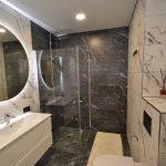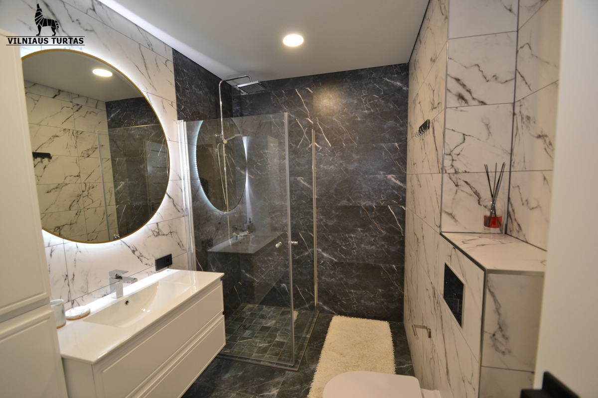 Erdvi vonia, daug vietos daiktams (sieninės spintos)