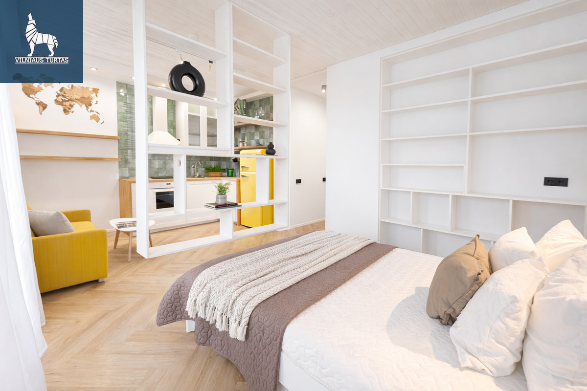 Protingai išplanuota buto erdvė: svetainė sujungta su virtuve, atskirta miegamojo zona, yra terasa. Panoraminiai langai orientuoti į rytus, todėl butas šviesus ir jaukus. Nuomojamas su visais baldais ir buitine technika, tad galima iš karto keltis gyventi. Centrinis-kolektorinis šildymas reguliuojamas pagal poreikį, įrengta rekuperacinė sistema užtikrina nuolatinę oro gaivą. Butui priklauso terasa, kurią galėsite mėgautis jaukiais vasaros vakarais.