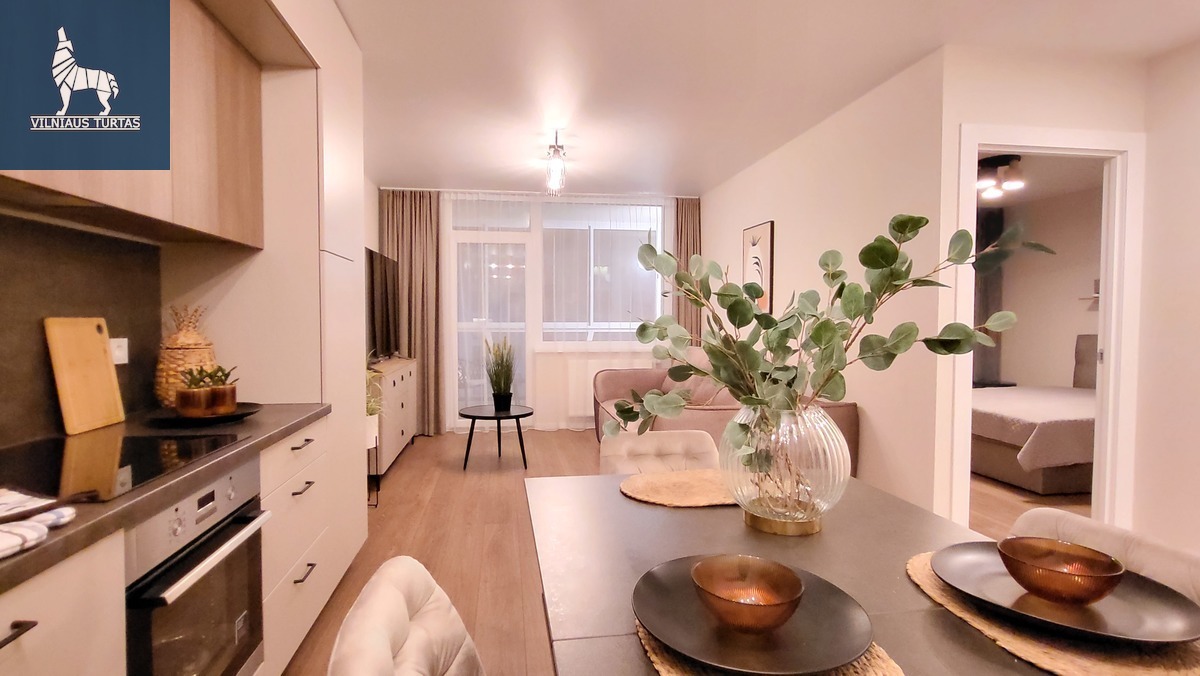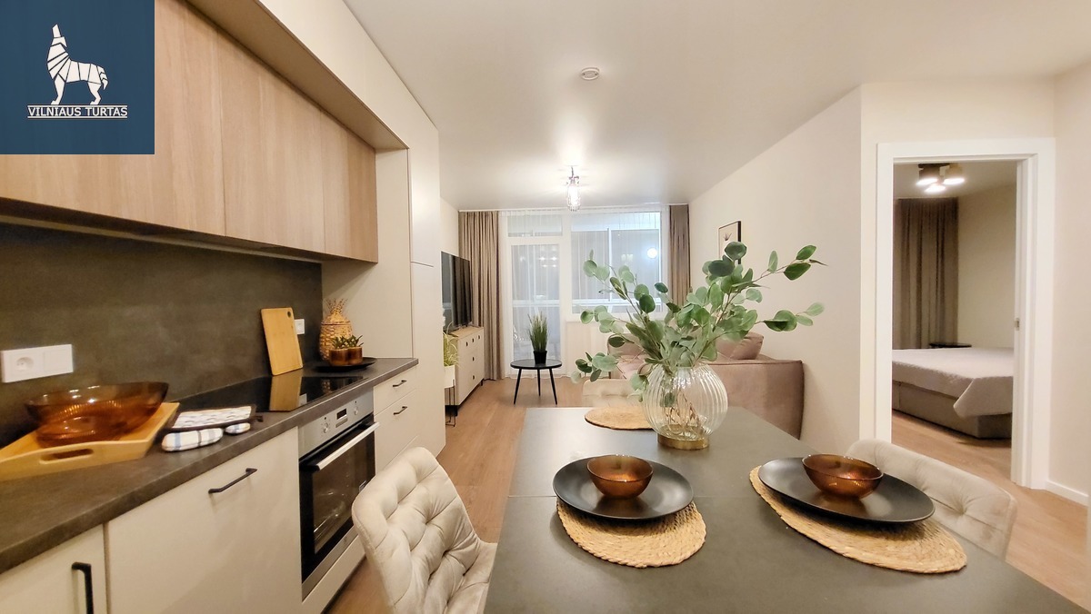 Ramioje ir patogioje Justiniškių mikrorajono vietoje parduodamas skoningai, moderniai ir pilnai įrengtas 2 dviejų kambarių su BALDAIS ir BUITINE TECHNIKA, 55,55 kv.m. butas su 9,38 kv.m. lodžija, 4a/8. Negyventas.
