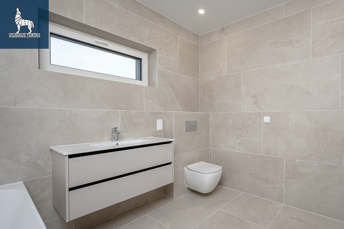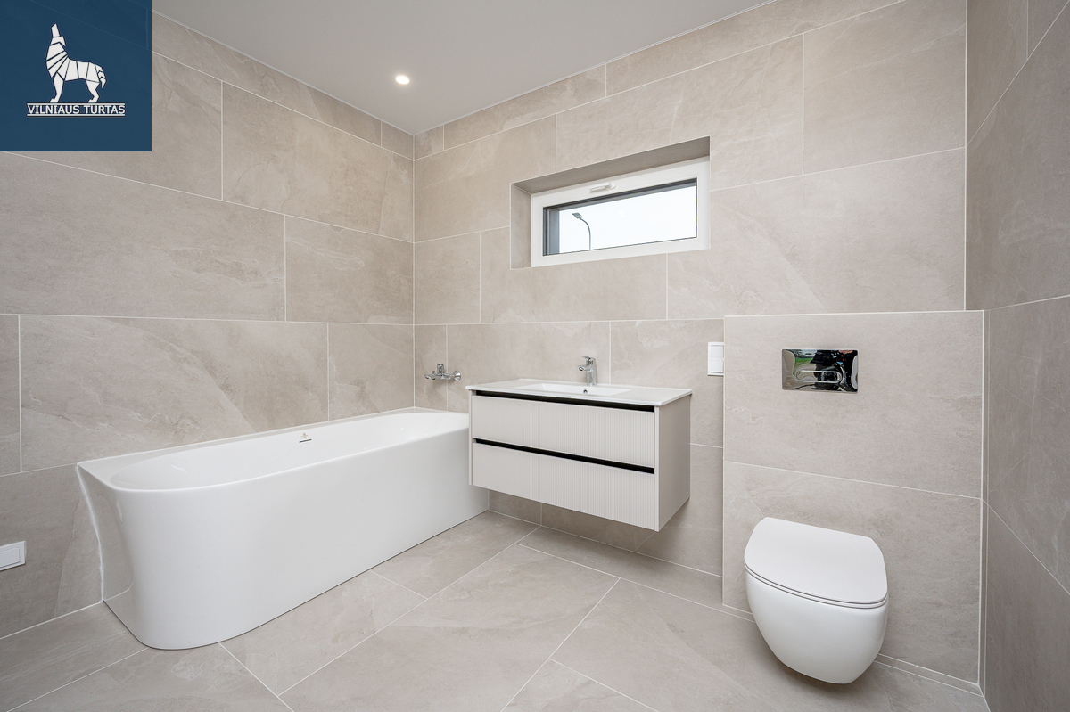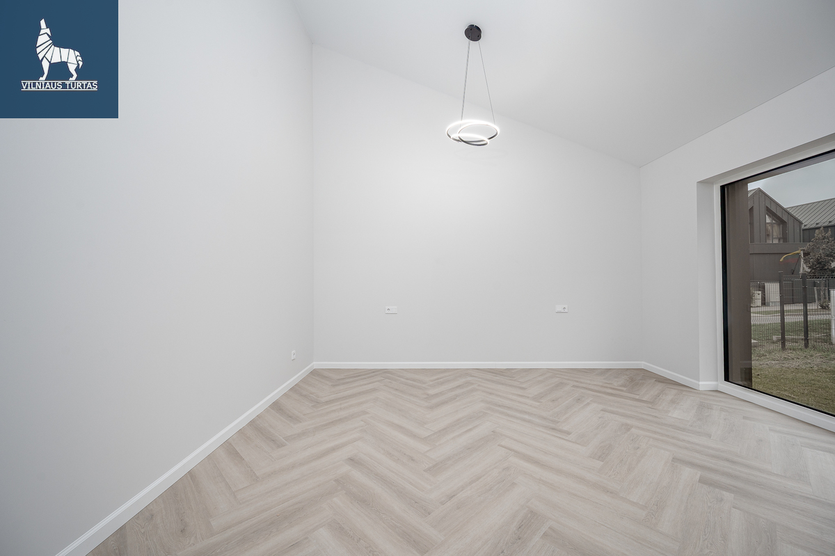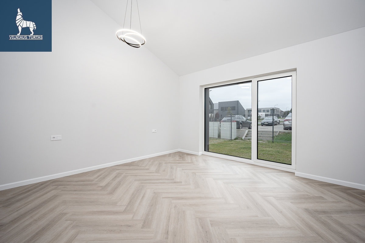 Vidaus apdailoje vyrauja neutralūs tonai ir praktiškos medžiagos – dažytos sienos, vinilo grindys, vonios kambaryje plytelės. Šildymas – numatytas aeroterminis (oras–vanduo) su grindiniu šildymu visame name.