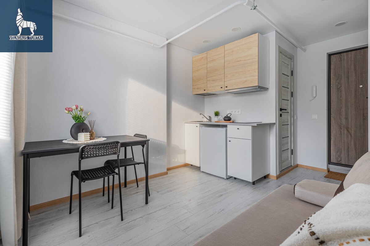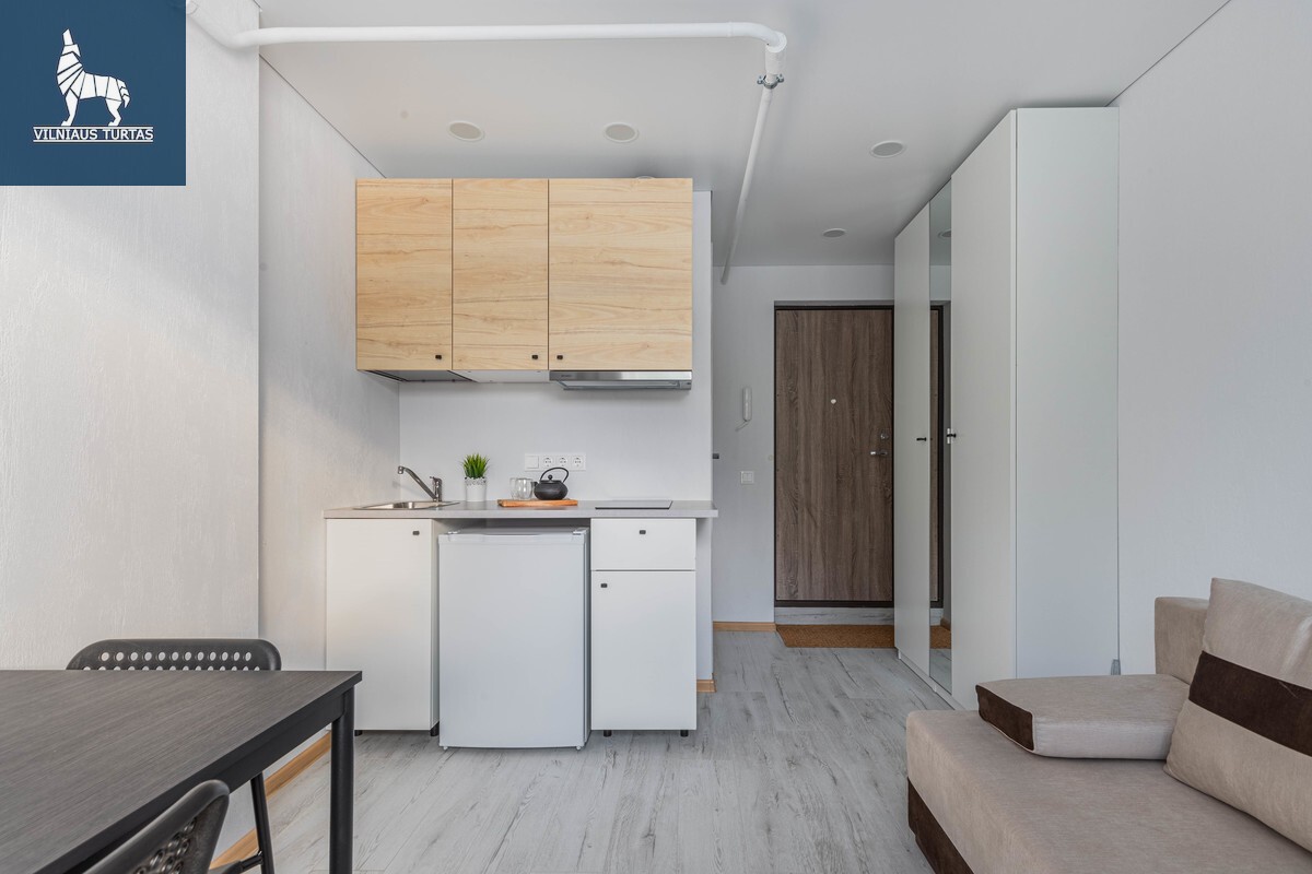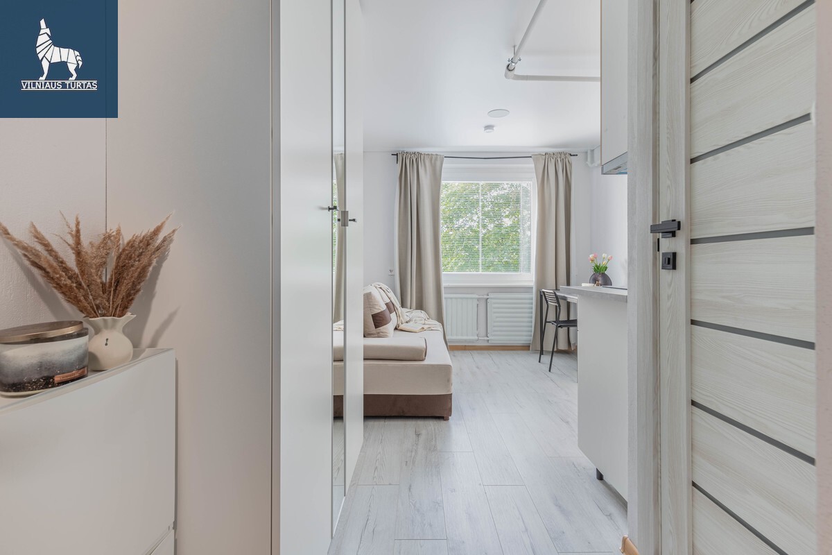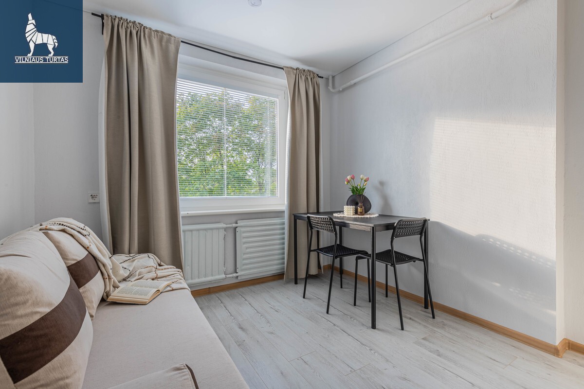 Karoliniškių mikrorajone, ramioje ir patogioje gyvenimui vietoje nuomojama šviesi, jauki, šilta, naujai įrengta ir tinkama gyvenimui čia ir dabar, 1no kambario butas-studija.