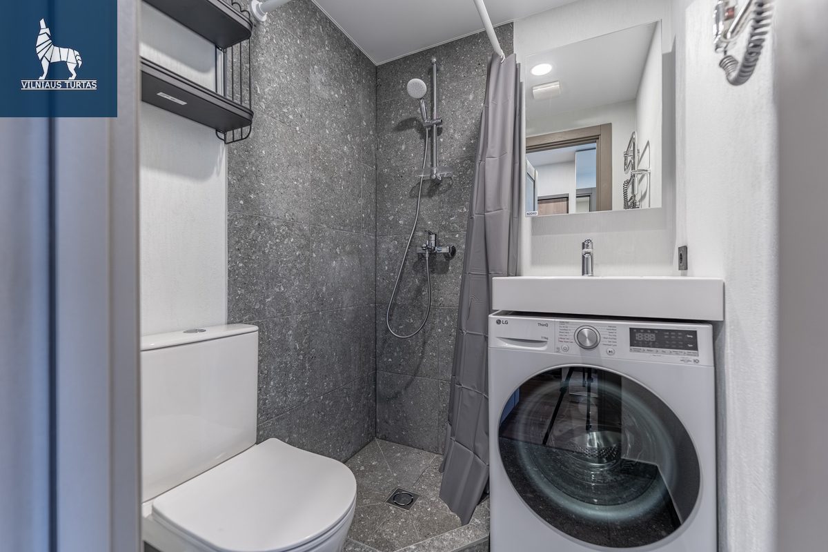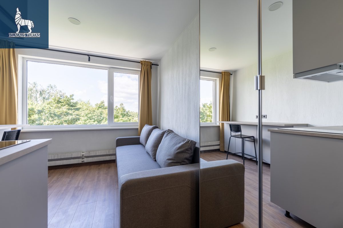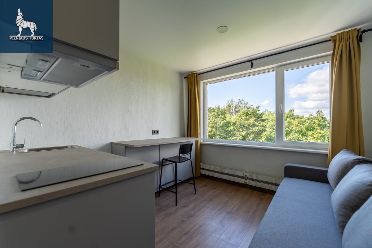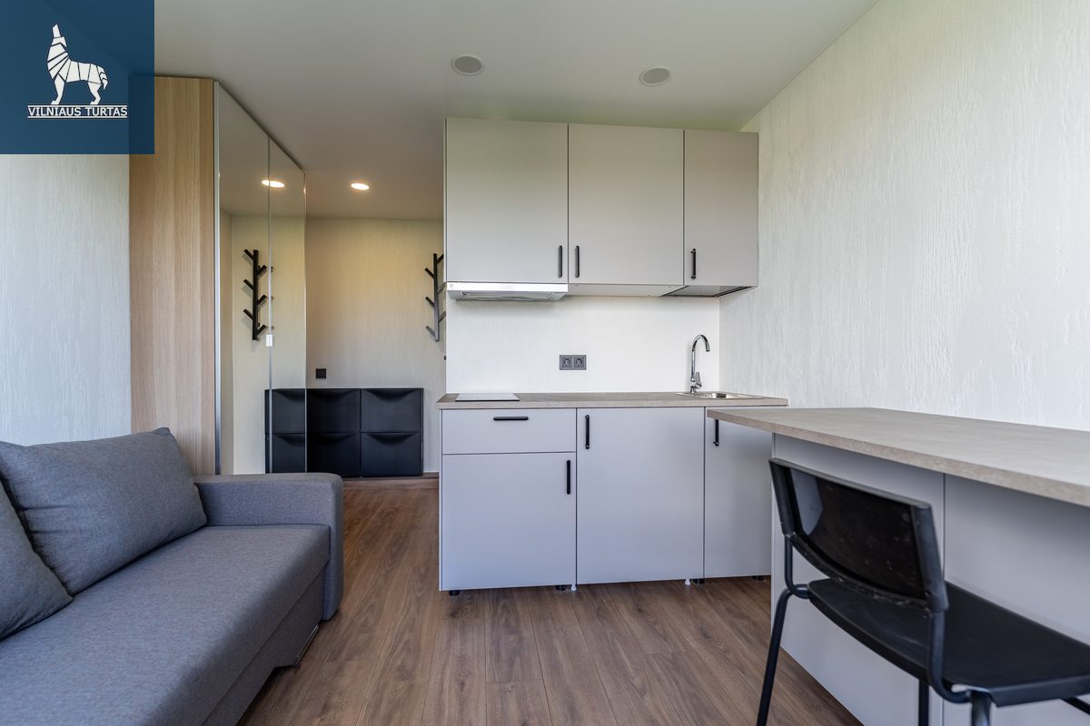 Studija pilnai įrengta – yra viskas, ko reikia patogiam gyvenimui be papildomų rūpesčių. Nauji baldai, nauja buitinė technika, šviesu, šilta ir jauku – galima įsikelti iš karto.