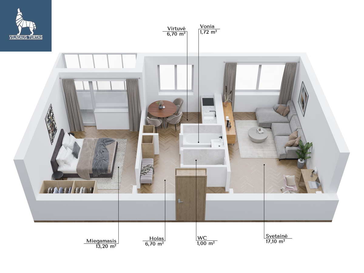✓ Yra galimybė persidaryti į trijų kambarių butą perkeliant virtuvę