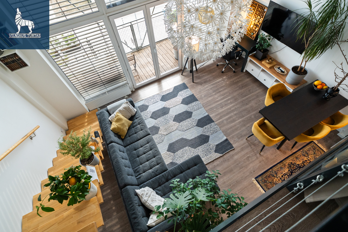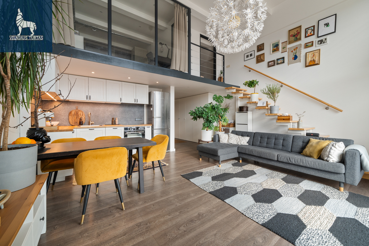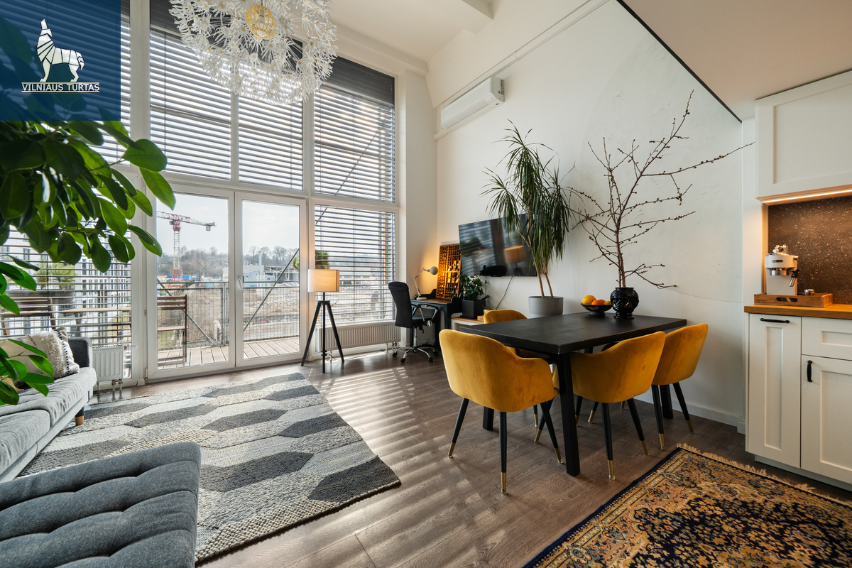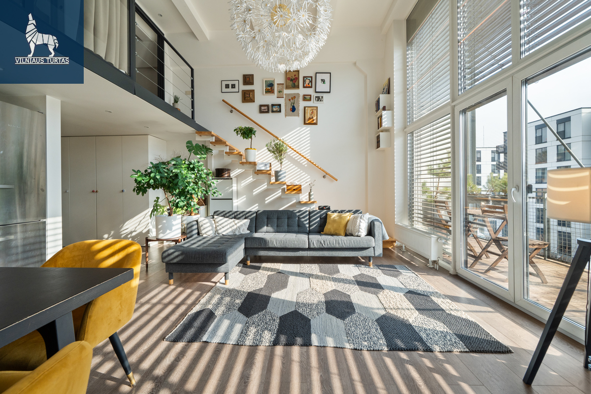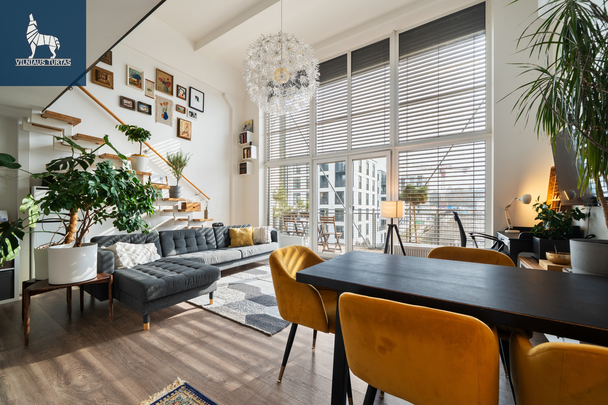 Šiuose namuose pirmiausia pasitinka erdvė ir šviesa. Per beveik 4,4 m aukščio lubas krentanti dienos šviesa užlieja visą svetainę, sukurdama lengvumo ir laisvės pojūtį, kurio taip trūksta įprastuose butuose. Moderniai ir skoningai įrengtas interjeras, aukšti vitrininiai langai bei išėjimas į didelę terasą leidžia mėgautis ne tik jaukiu vidumi, bet ir rytiniu kavos puodeliu terasoje.