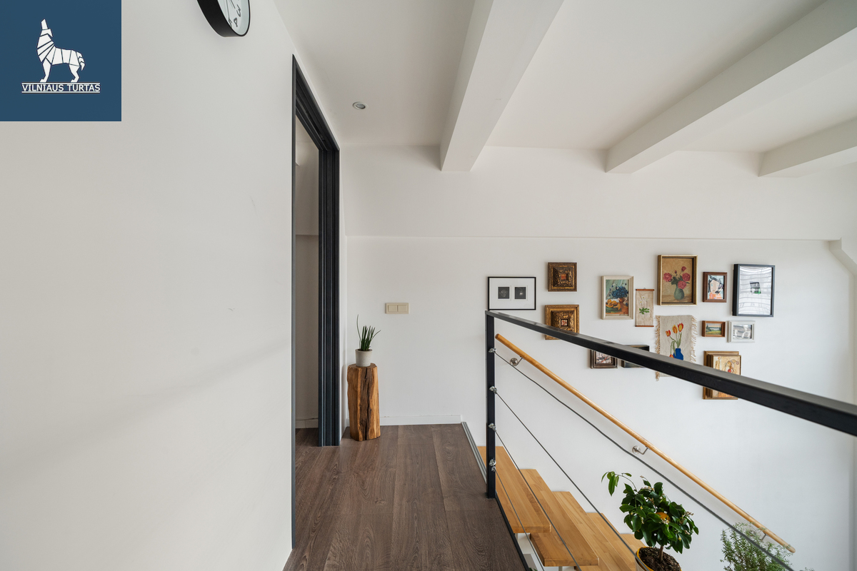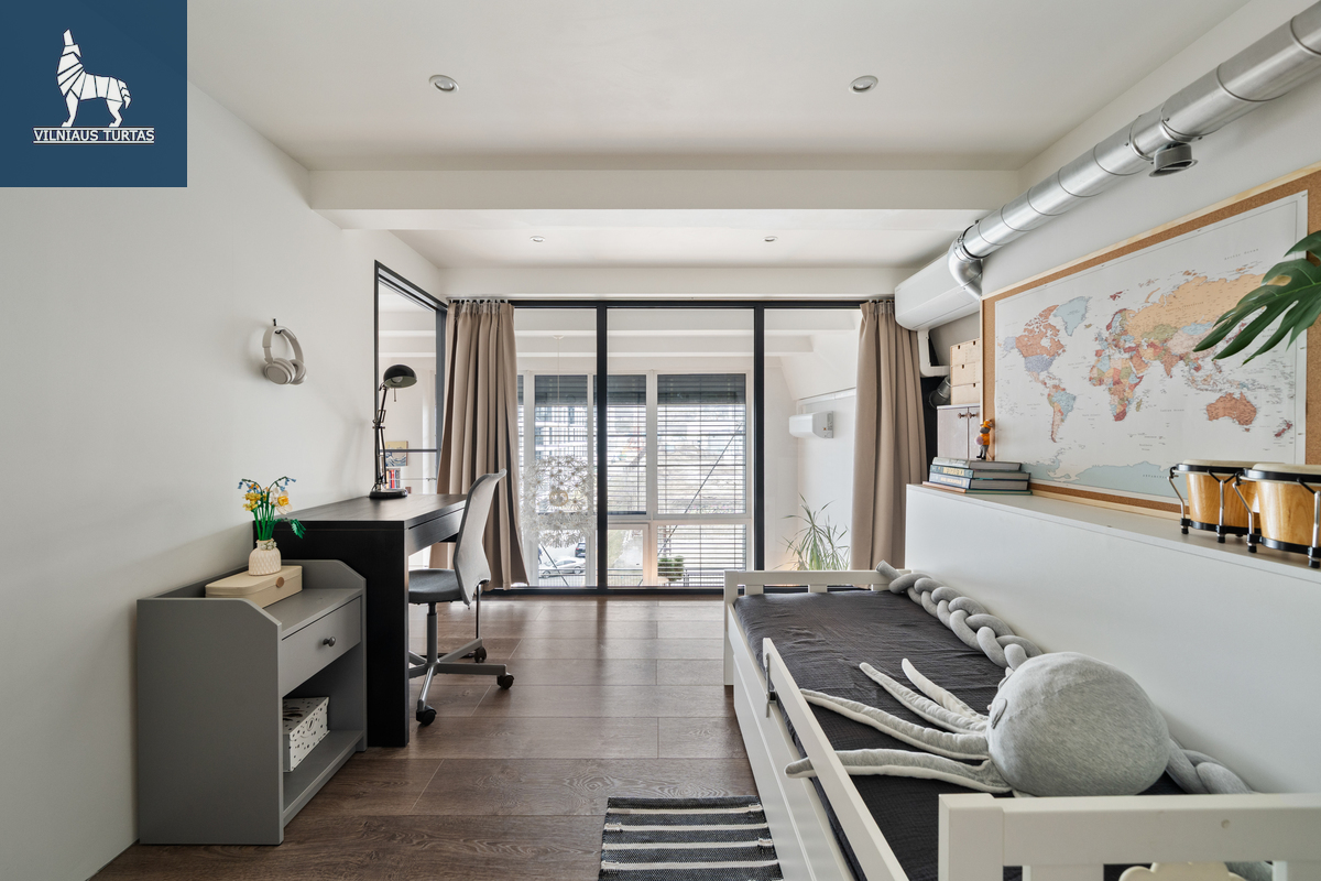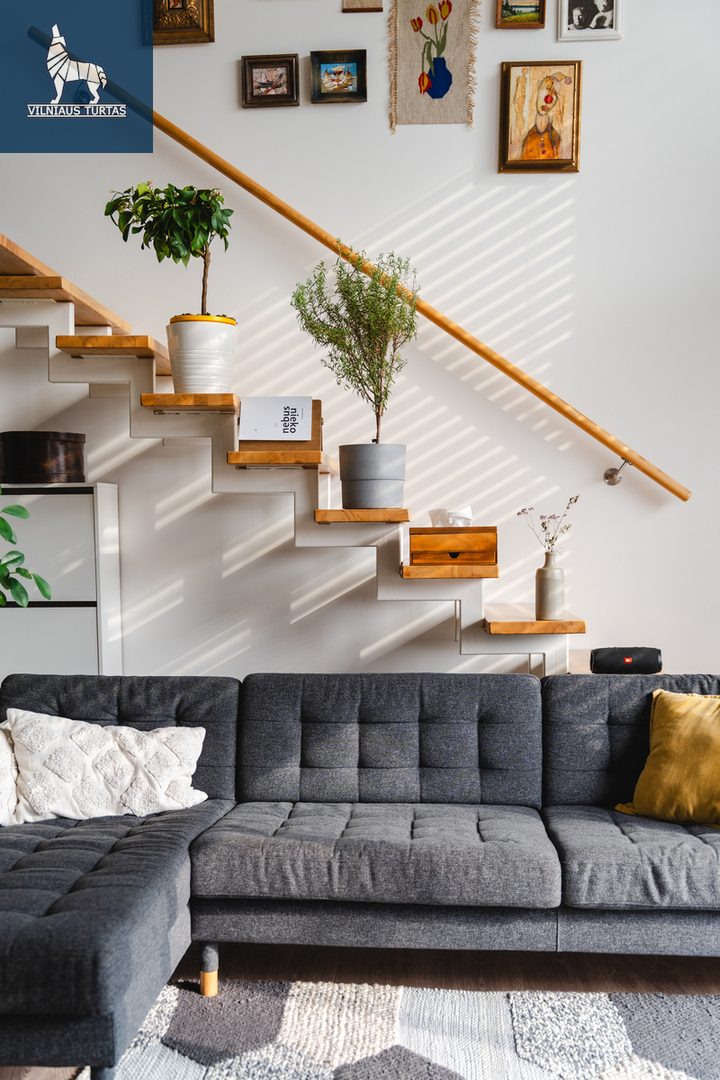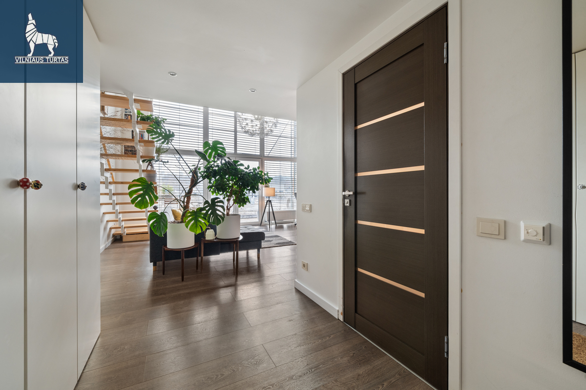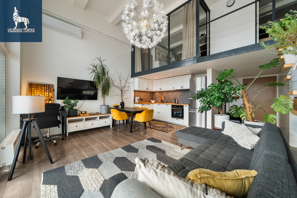 Šiuose namuose pirmiausia pasitinka erdvė ir šviesa. Per beveik 4,4 m aukščio lubas krentanti dienos šviesa užlieja visą svetainę, sukurdama lengvumo ir laisvės pojūtį, kurio taip trūksta įprastuose butuose. Moderniai ir skoningai įrengtas interjeras, aukšti vitrininiai langai bei išėjimas į didelę terasą leidžia mėgautis ne tik jaukiu vidumi, bet ir rytiniu kavos puodeliu terasoje.