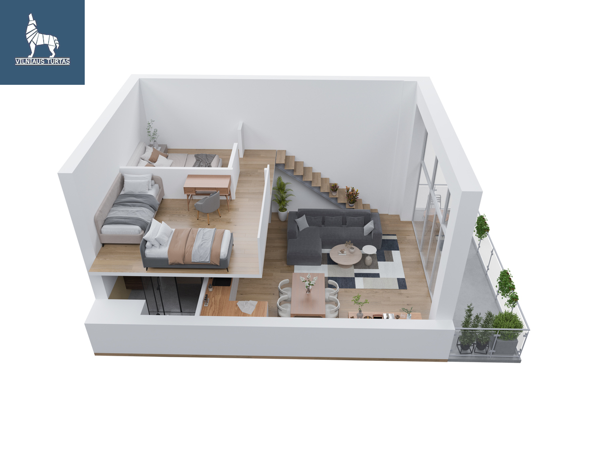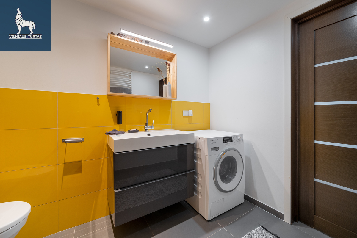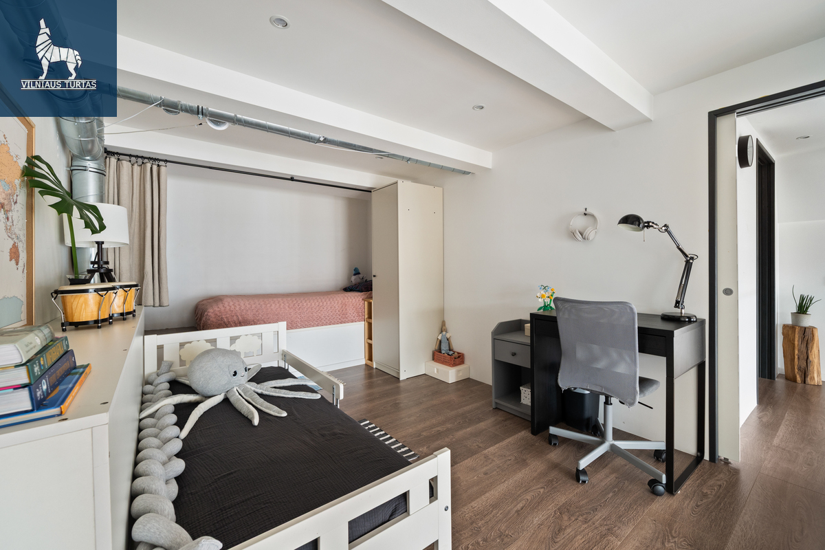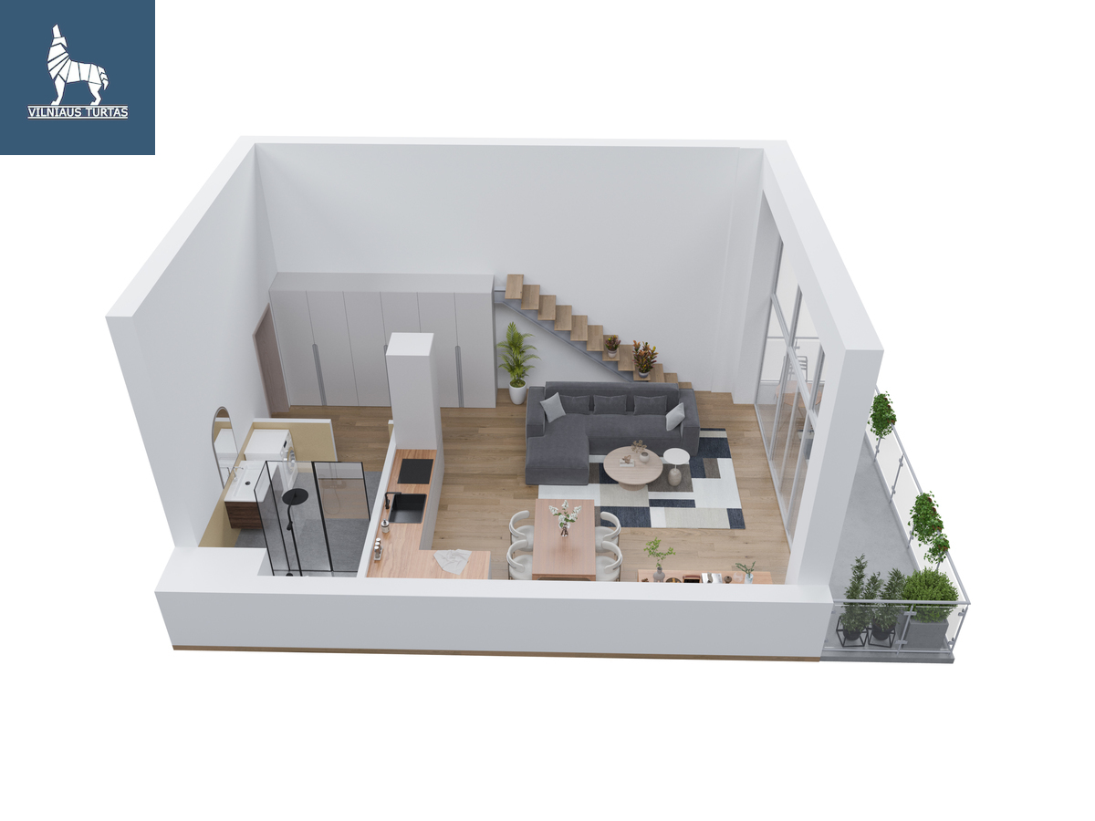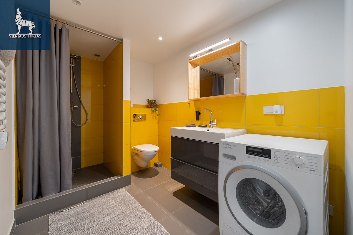 Šiuose namuose pirmiausia pasitinka erdvė ir šviesa. Per beveik 4,4 m aukščio lubas krentanti dienos šviesa užlieja visą svetainę, sukurdama lengvumo ir laisvės pojūtį, kurio taip trūksta įprastuose butuose. Moderniai ir skoningai įrengtas interjeras, aukšti vitrininiai langai bei išėjimas į didelę terasą leidžia mėgautis ne tik jaukiu vidumi, bet ir rytiniu kavos puodeliu terasoje.