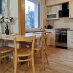 • Virtuvė-svetainė: Virtuvė pusiau sujungta su svetaine – patogu, bendravimui ir kasdieniam gyvenimui. Yra televizorius. Įrengta viryklė su orkaite, gartraukis, didelis šaldytuvas ir mikrobangų krosnelė.