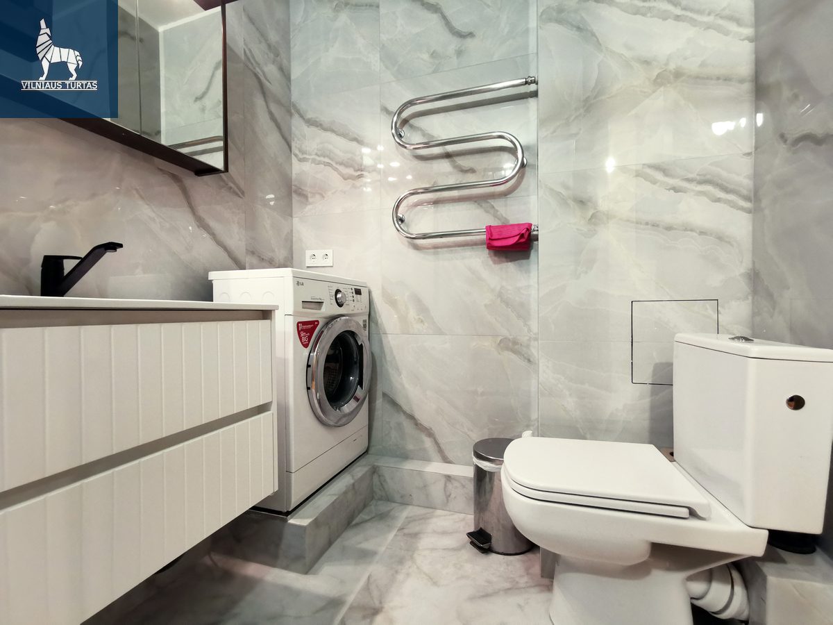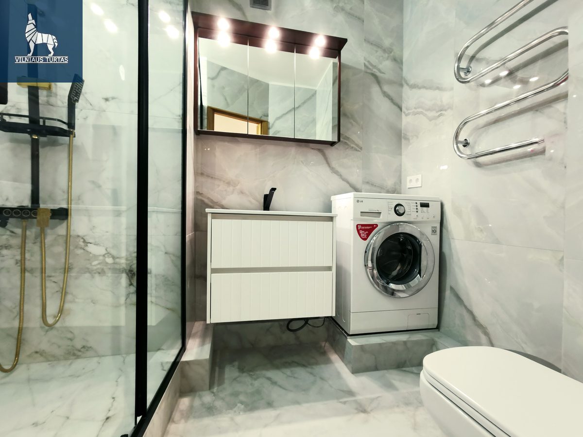 • Naujai suremontuota vonia: Modernus, marmuro stiliaus vonios kambarys su nauja santechnika ir skalbykle.
