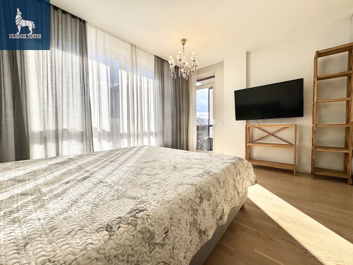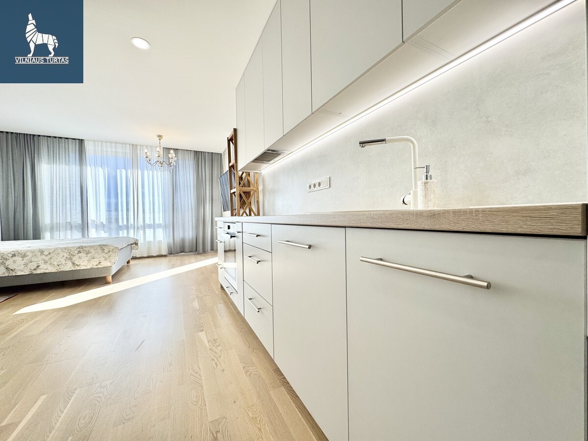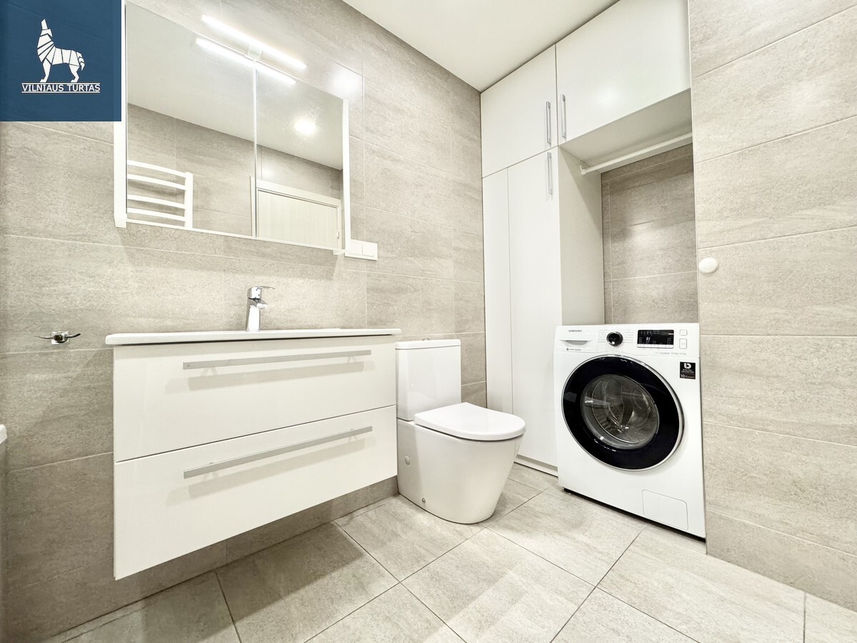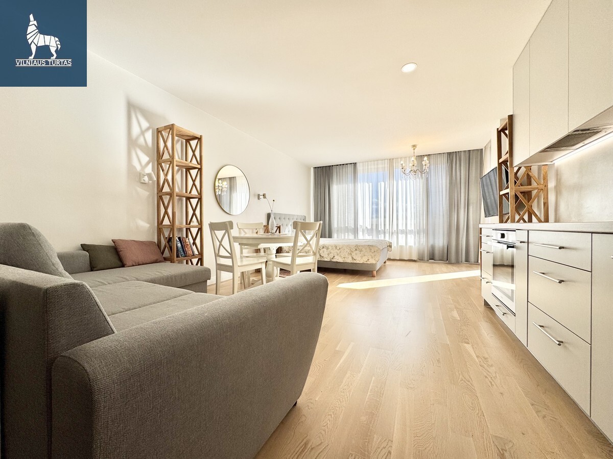 Nuomojamas modernus, šviesus ir pilnai įrengtas 1 kambario butas su balkonu Naujamiestyje – prestižinėje Kauno gatvėje, 2017 m. statybos name.