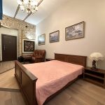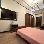 Kambarys 1: dvigulė lova, komoda, spinta, spintelės prie lovos, odinė sofa, staliukas, pufikas, didelis televizorius.