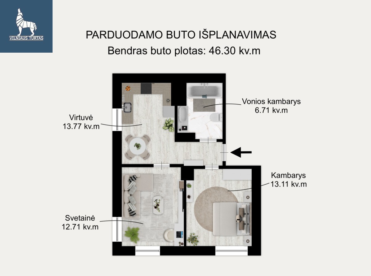 Parduodamas butas Prūsų g. , Naujininkuose, Vilniuje, 46.3 kv.m ploto, 2 kambariai