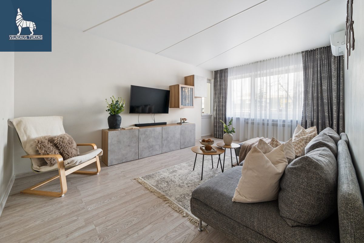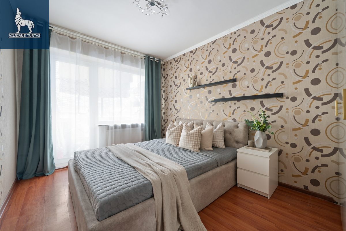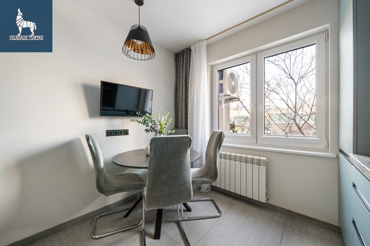 Svetainė erdvi ir šviesi, iš jos – išėjimas į suremontuotą, įstiklintą balkoną. Virtuvėje prieš trejus metus atliktas kapitalinis remontas, įrengtos šildomos grindys, o visame bute (išskyrus pagrindinį miegamąjį) – įtempiamos lubos. Atskiri vonios ir WC kambariai, atskira skalbyklos patalpa bei tamsus sandėliukas suteikia dar daugiau patogumo kasdienybėje. Papildomą komfortą užtikrina kondicionierius bei pakeisti radiatoriai.