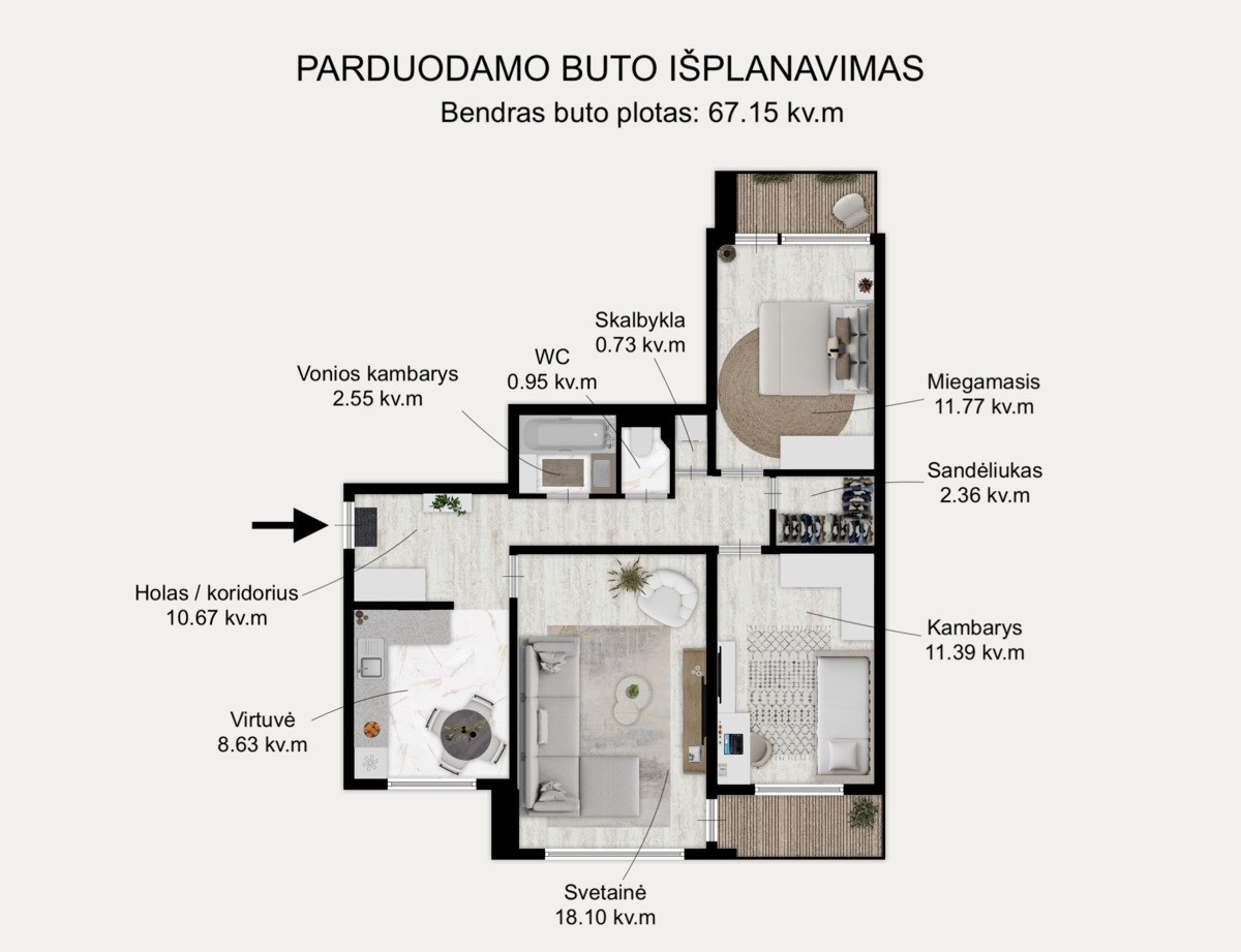 ・Plotas: 67.15 kv.m (3 kambariai + virtuvė + vonios kambarys + wc + skalbykla + sandėliukas)