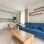 Virtuvės įranga – visa ko reikia – šaldytuvas, orkaitė, mikrobangų krosnelė, indaplovė, kaitlentė, garintuvas.