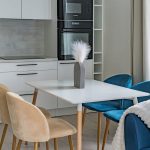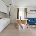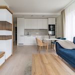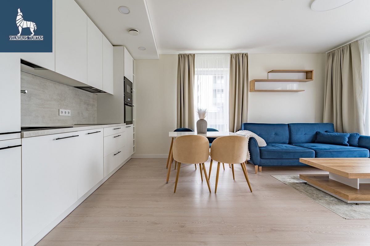 3 kambariai – svetainė sujungta su virtuve ir du izoliuoti miegamieji.