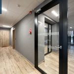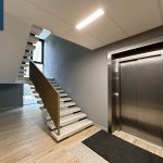 Šiuolaikiška šviesi laiptinė, langai plastikiniai, kameros.