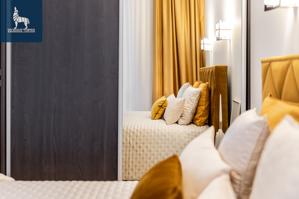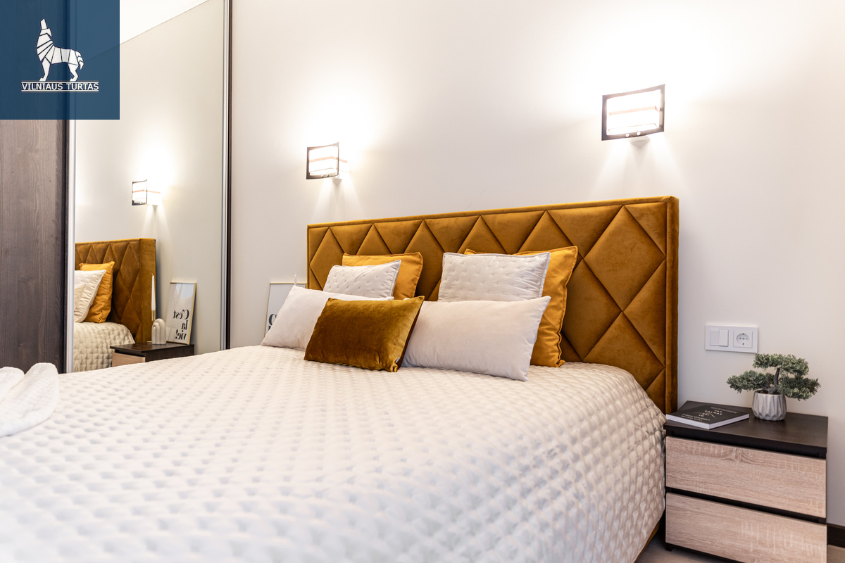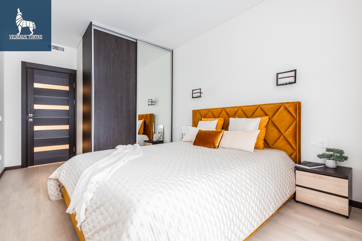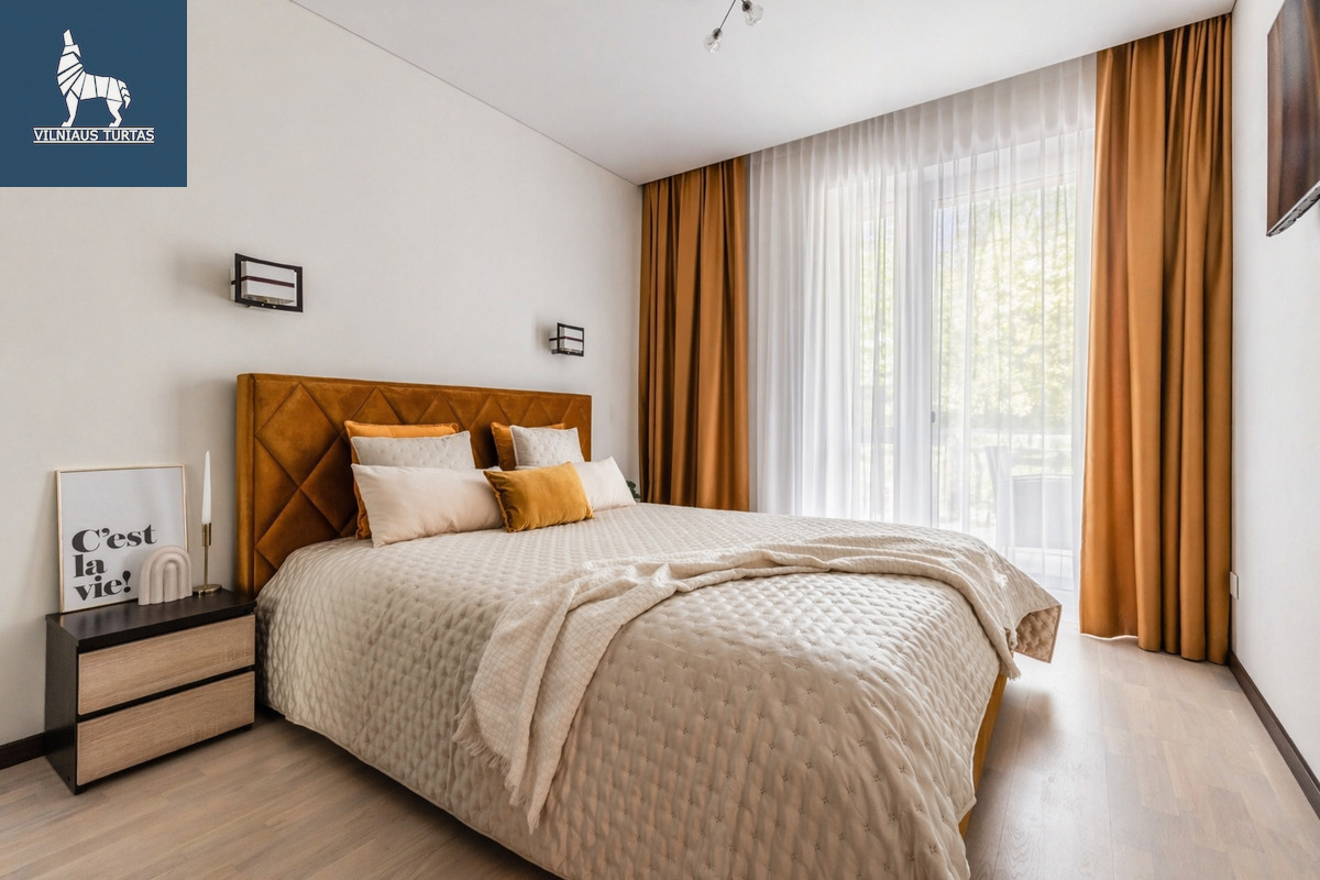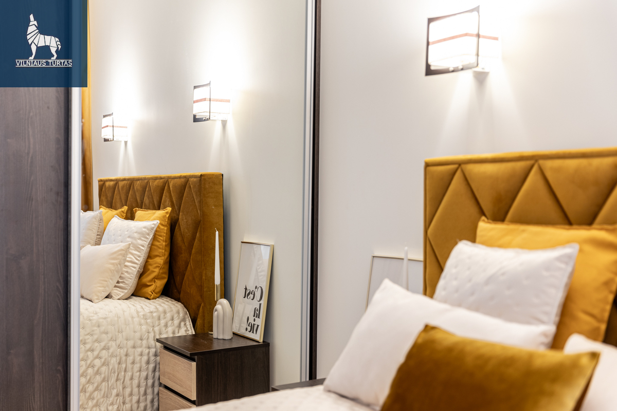 – Miegamajame: dvigulė lova su čiužiniu, spintelės, erdvi sieninė spinta, kondicionierius.