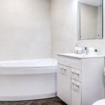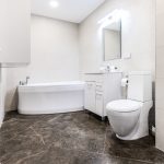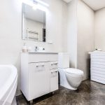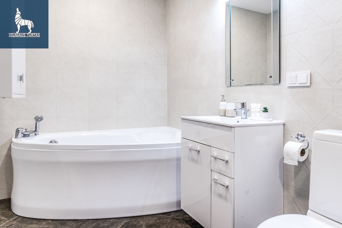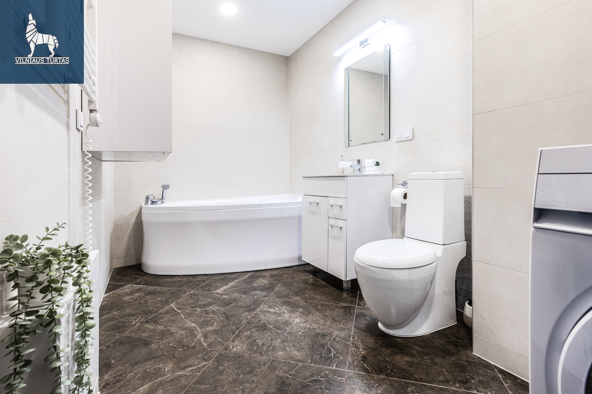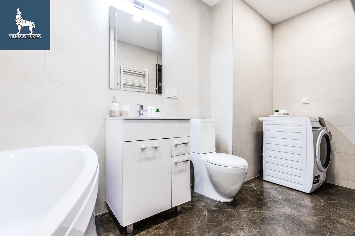 – Vonioje: erdvi vonia, wc, kriauklė, skalbimo mašina su džiovykle, spintelė.