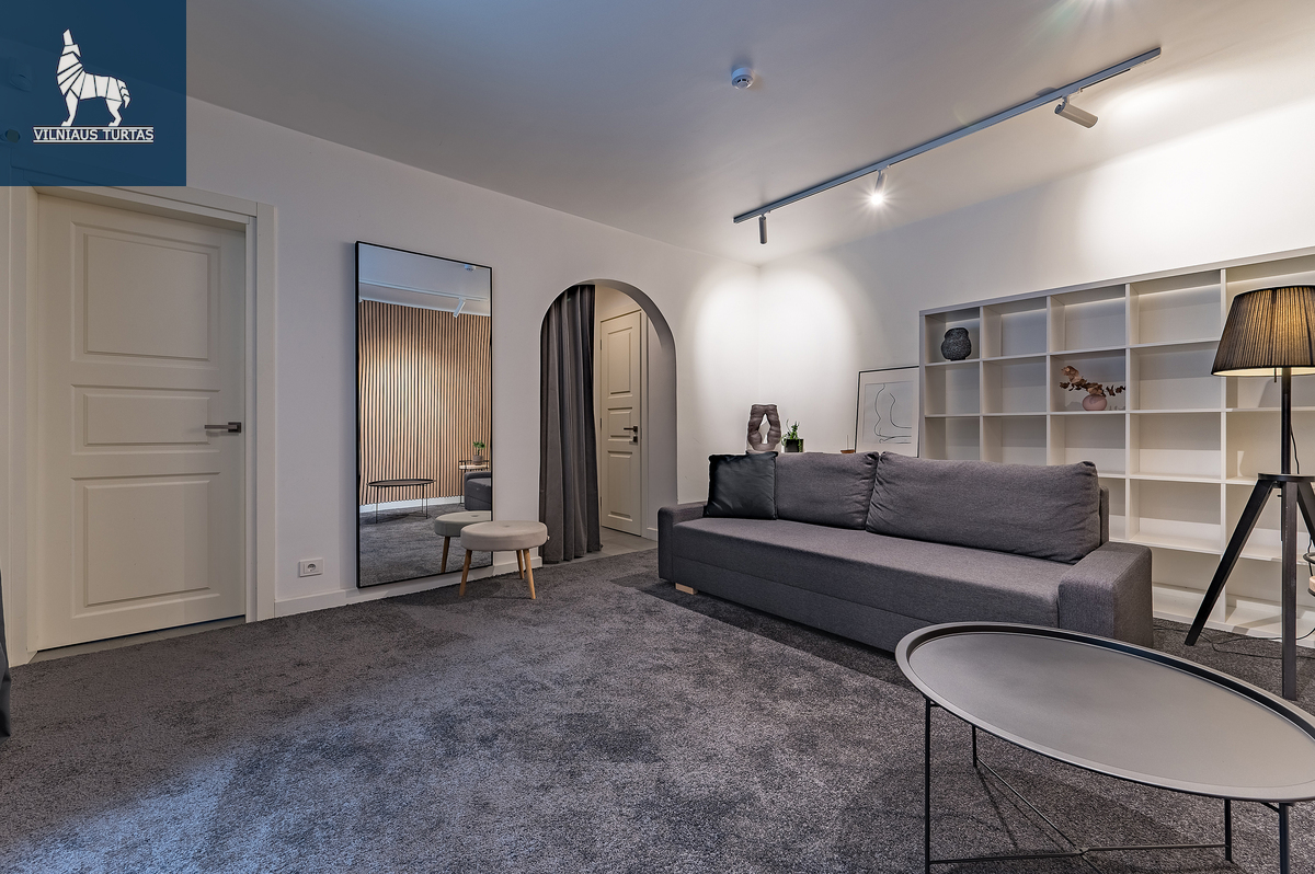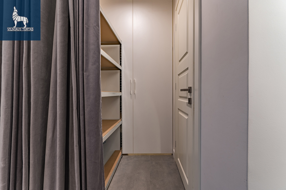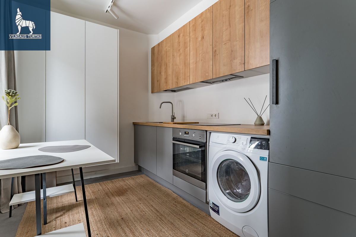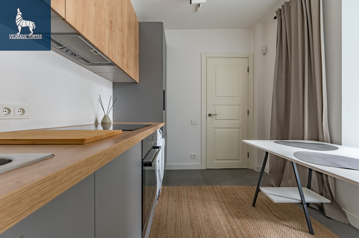 Butas yra funkcionalus. Virtuvė su visa įranga, kaitlentė, orkaitės, šaldytuvas, šaldiklis, gartraukis, indaplovė, skalbimo mašina, labai platus stalviršis patogiam maisto ruošimui, daug vietos virtuvės spintelėse ir spintose. Svetainėje – miegama sofa-lova, lentynos, komoda, didelis veidrodis, toršeras, kondicionierius. Butas nuomojamas su baldais.