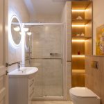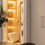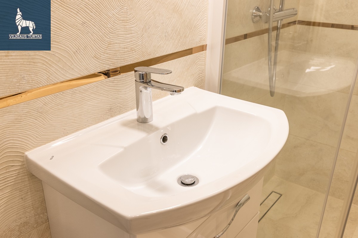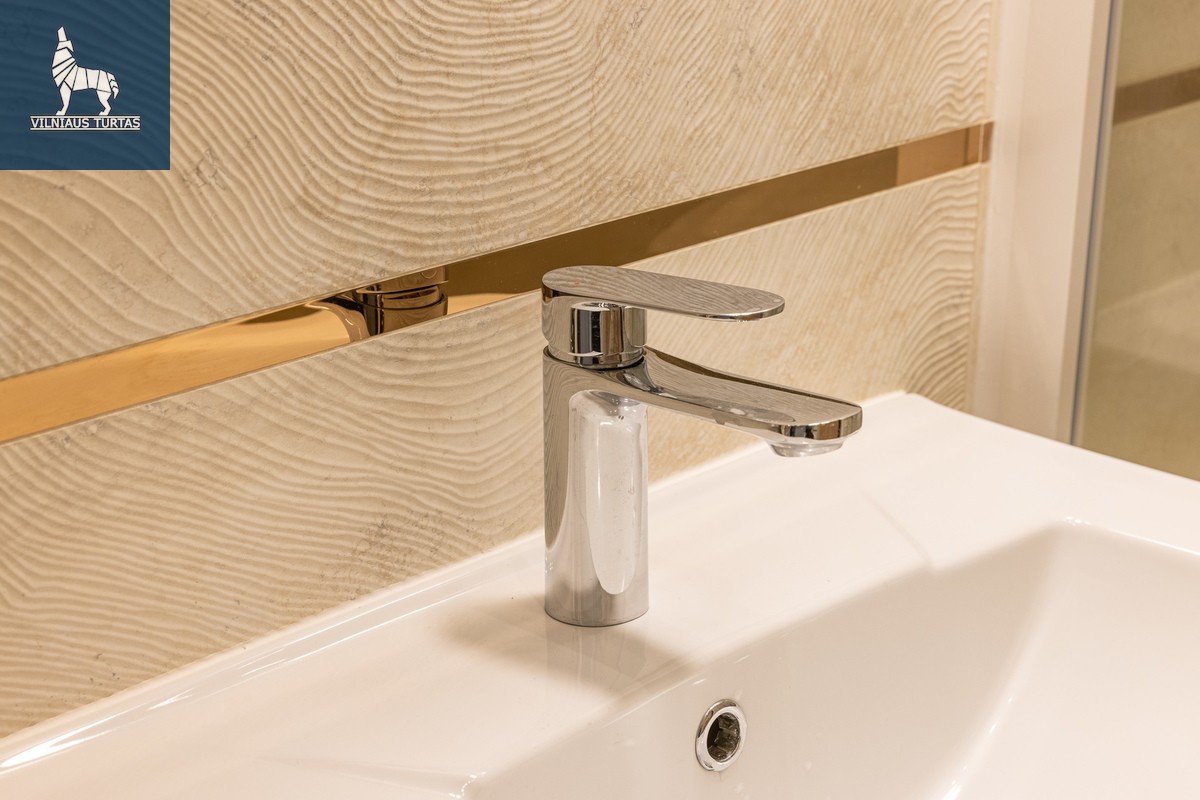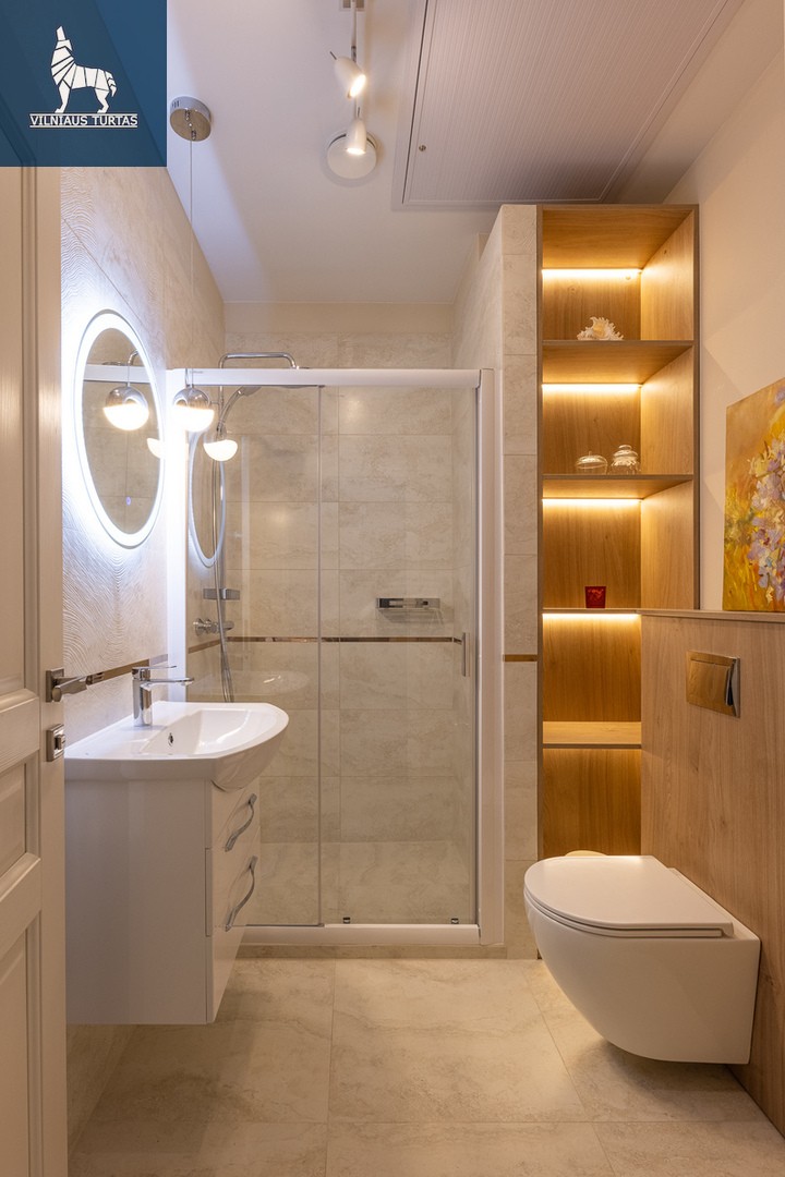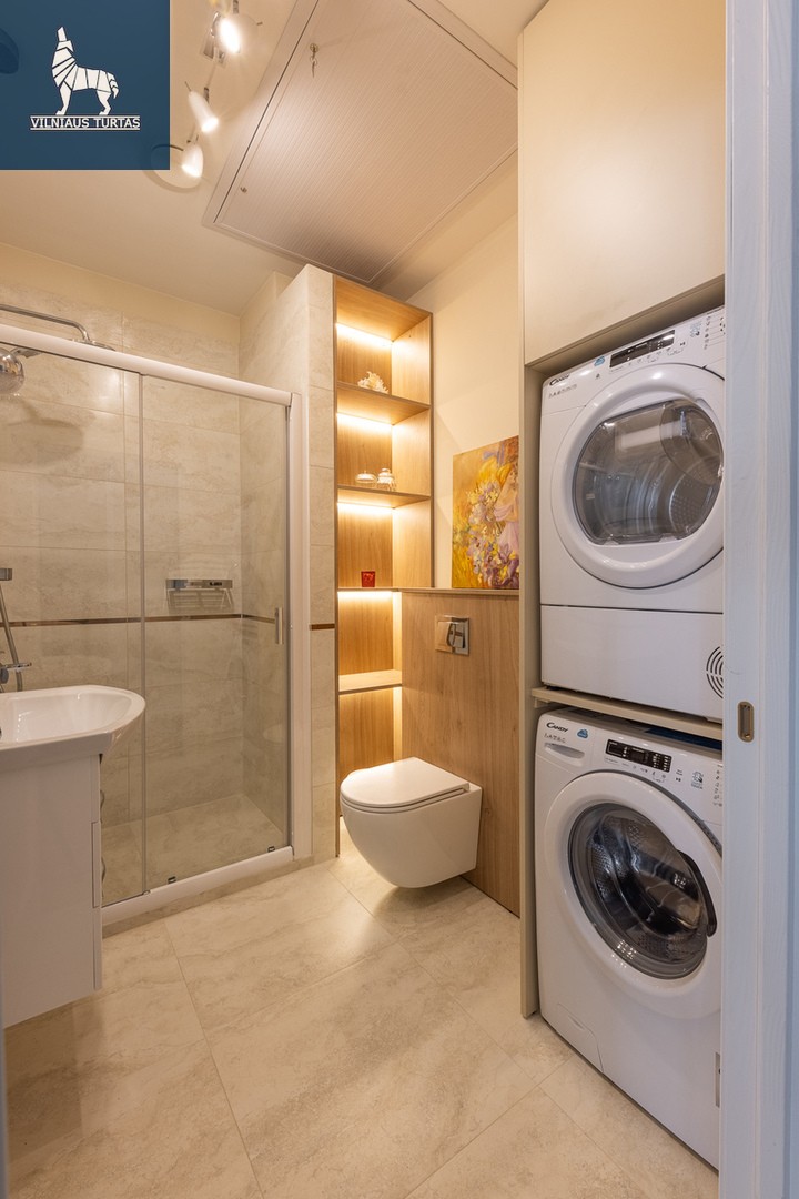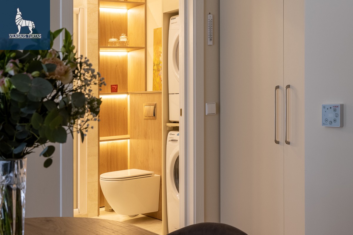 -Vonios kambarys: dušo kabina su „Hansgrohe“ sistema, skalbimo ir džiovinimo mašinos, šviečiantis veidrodis, lentyna su LED apšvietimu;