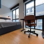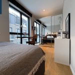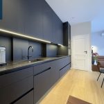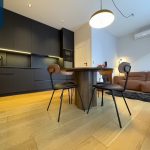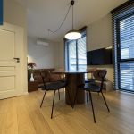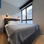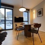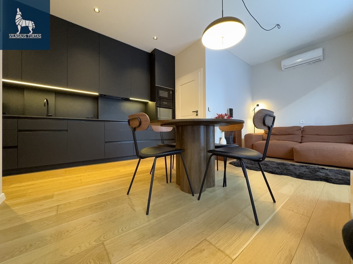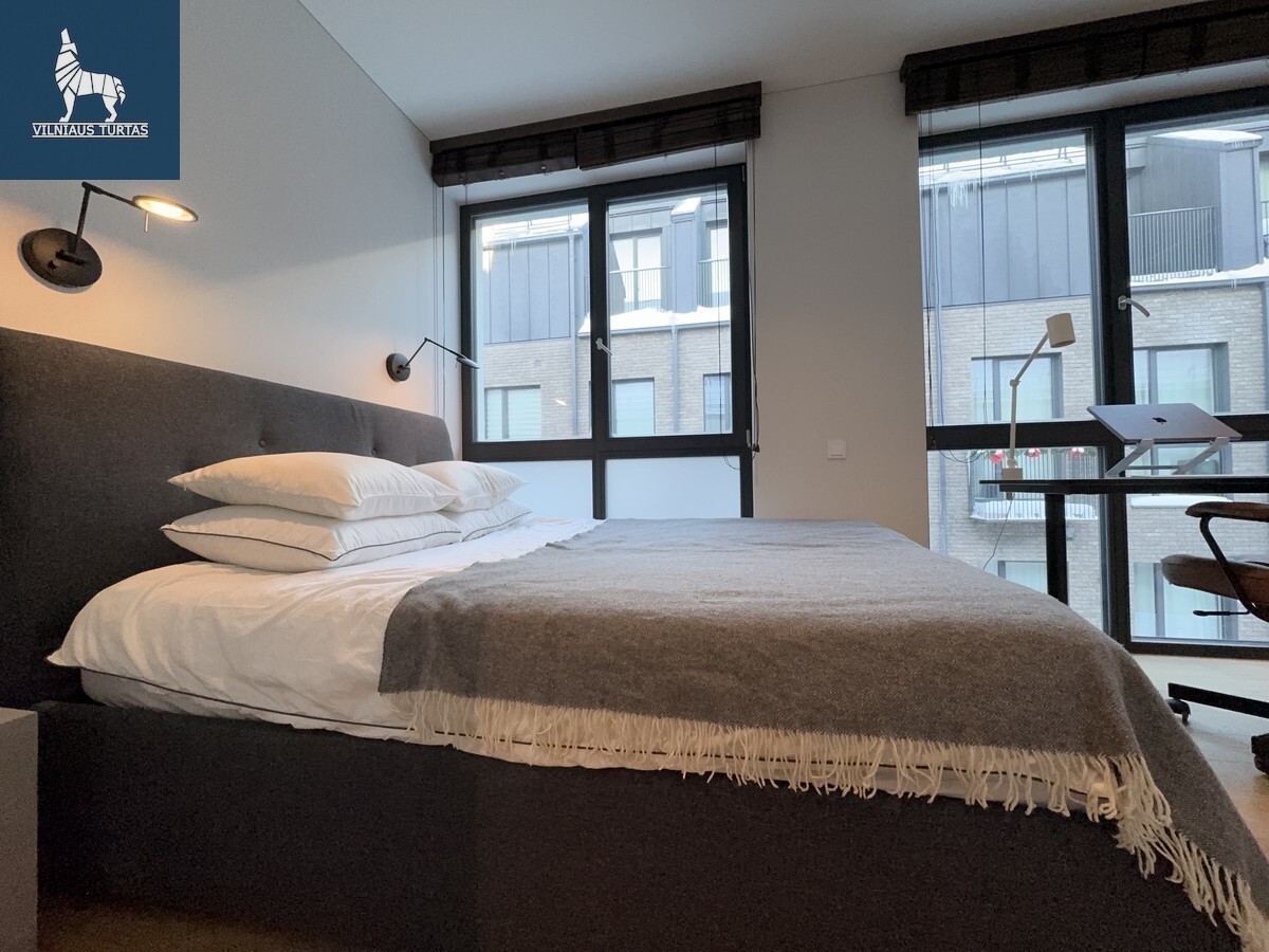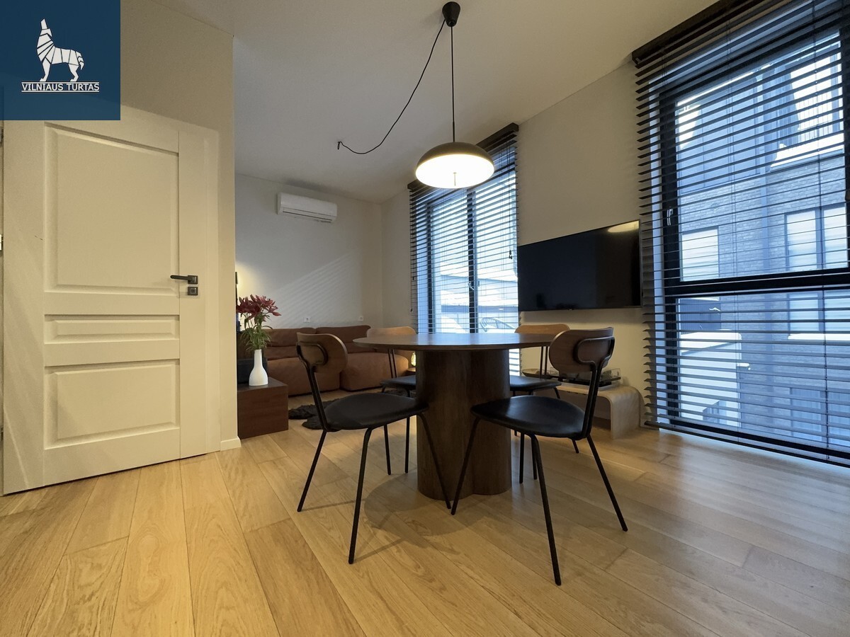 Svetainės ir virtuvės zona sukurta šiuolaikiškam miesto gyvenimui – minimalistinė, tačiau labai funkcionali virtuvė, dizaineriškas valgomojo stalas, jauki poilsio zona su minkšta sofa ir išėjimu į terasą. Miegamasis – šviesus, ramus, su didele sienine spinta ir darbo zona prie lango.