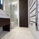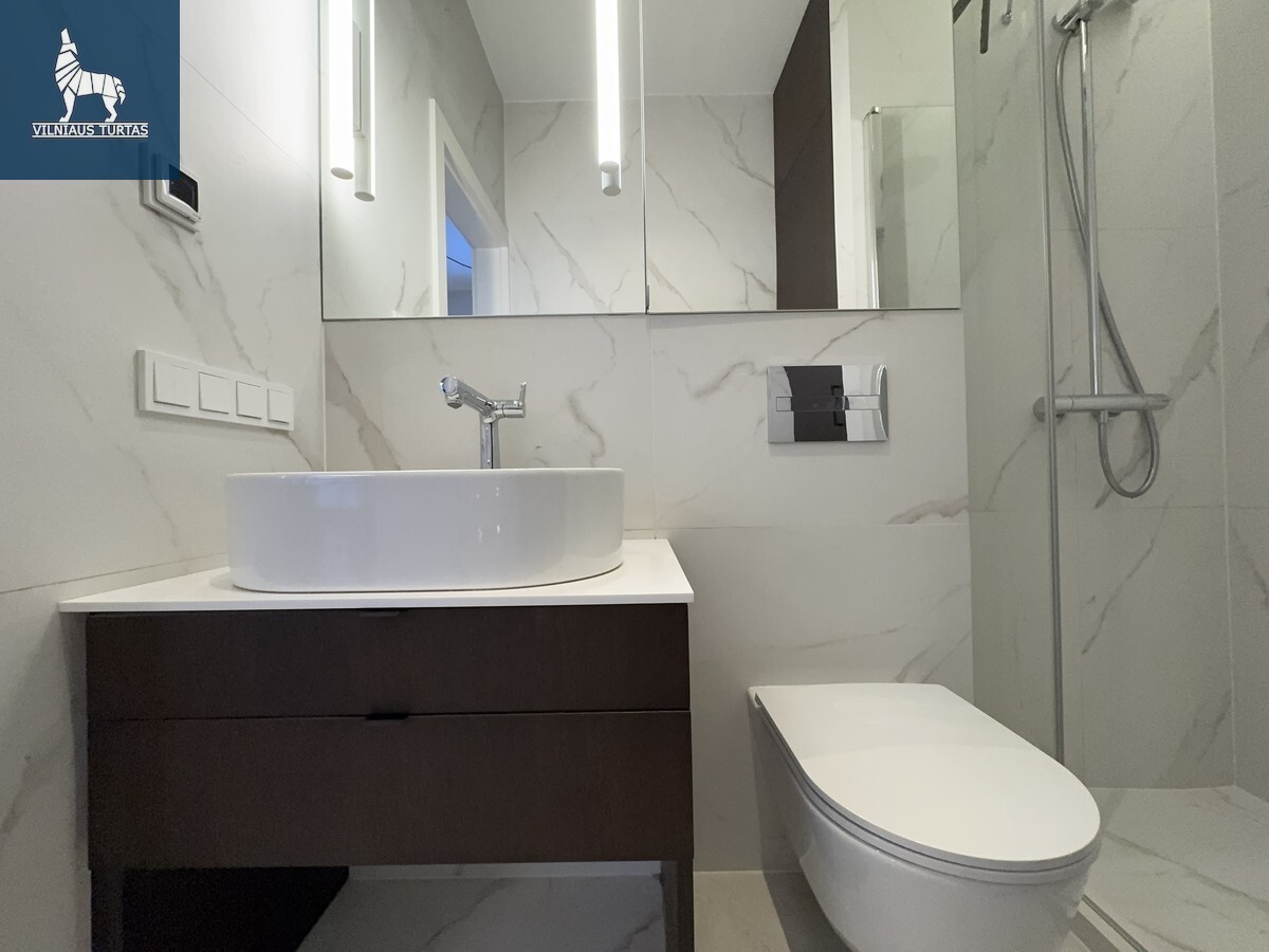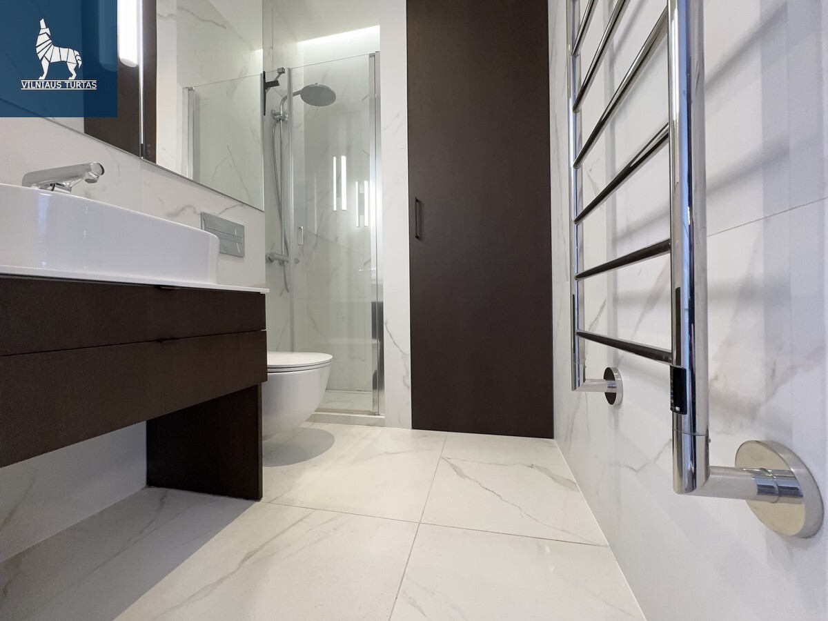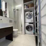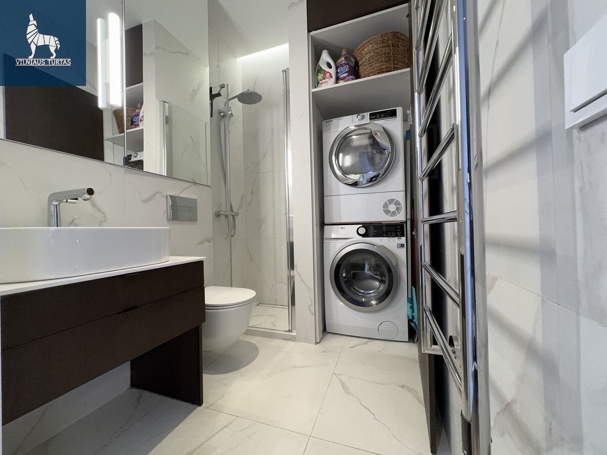 Vonios kambarys – modernus, su aukštos klasės apdaila, dušu ir skalbimo bei džiovinimo įranga.
