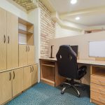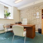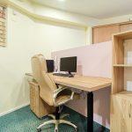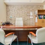 Erdvių išplanavimas: priėmimo zona su recepcija, laukiamasis, vadovo kabinetas, darbo zona, virtuvė;