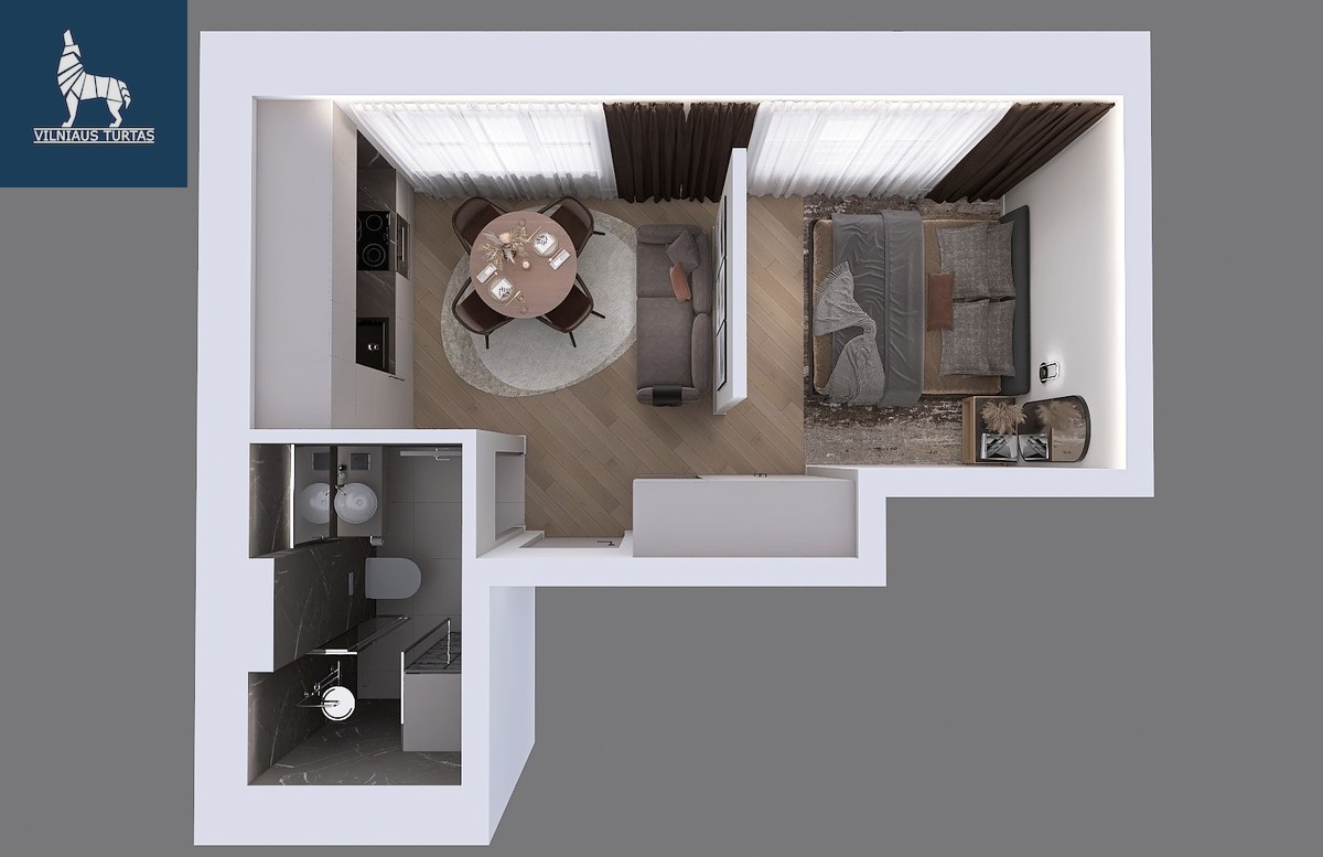 Parduodamas unikalus 1,5 kambario butas vienoje prestižiškiausių Vilniaus vietų – Tauro kalno papėdėje, vos minutė pėsčiomis iki Gedimino prospekto.