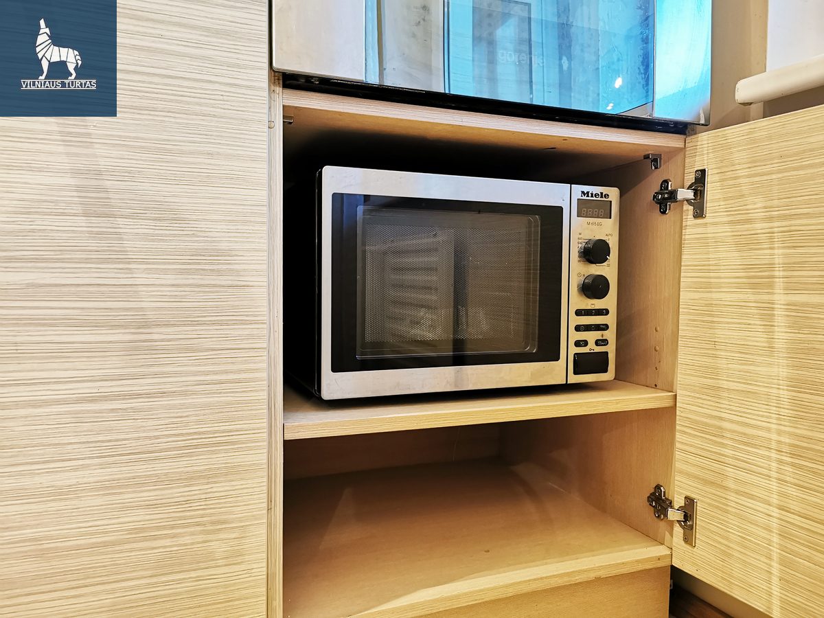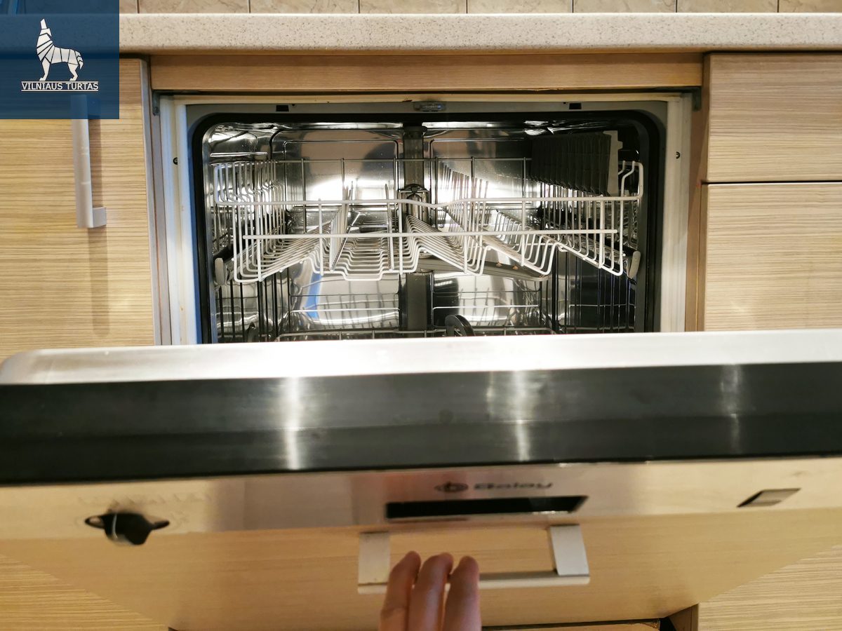 Pilna buitinė technika: viryklė su orkaite, indaplovė, mikrobangų krosnelė Miele, šaldytuvas, skalbyklė.