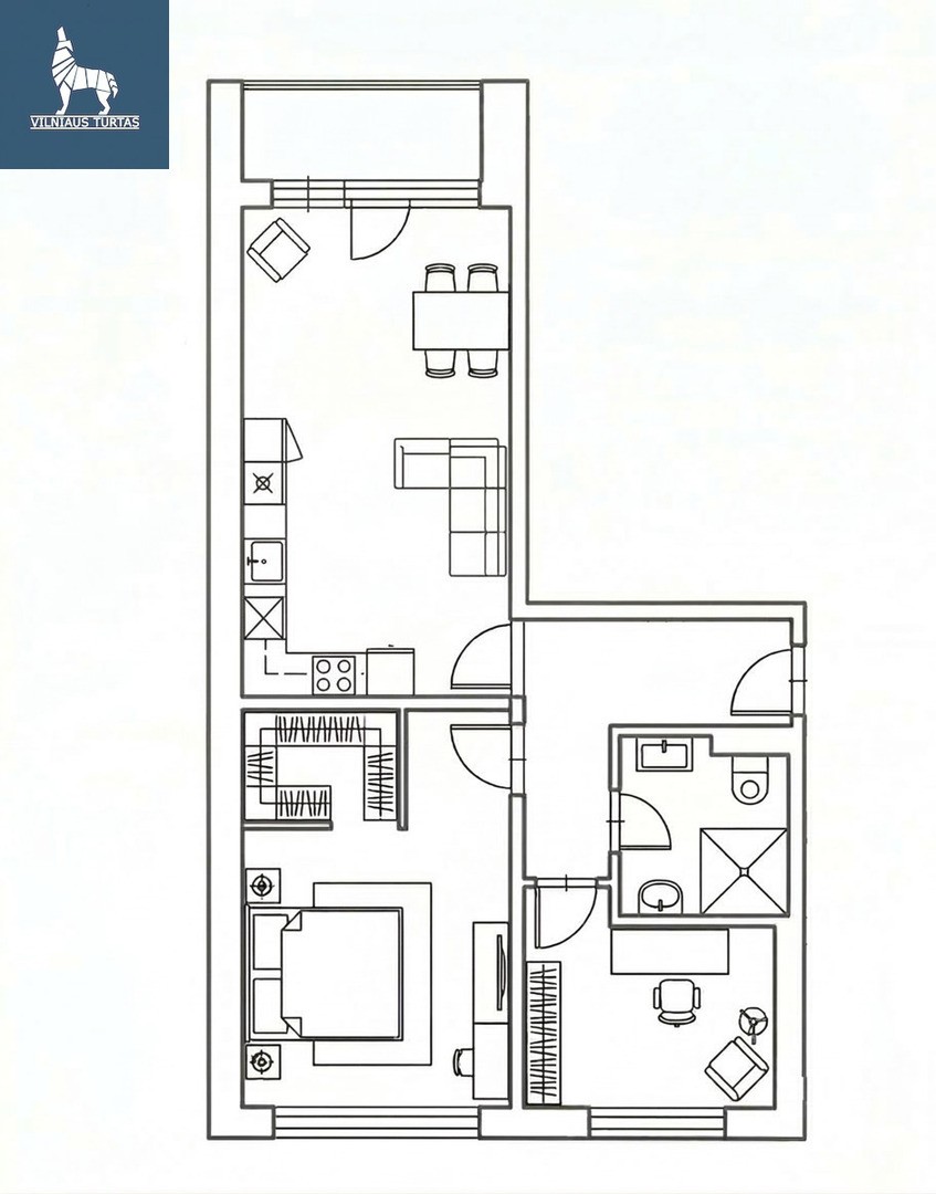 Funkcionalumas: 49,55kv. m plote suprojektuoti 3 kambariai (svetainė, miegamasis ir darbo/vaiko kambarys) bei erdvi drabužinė.