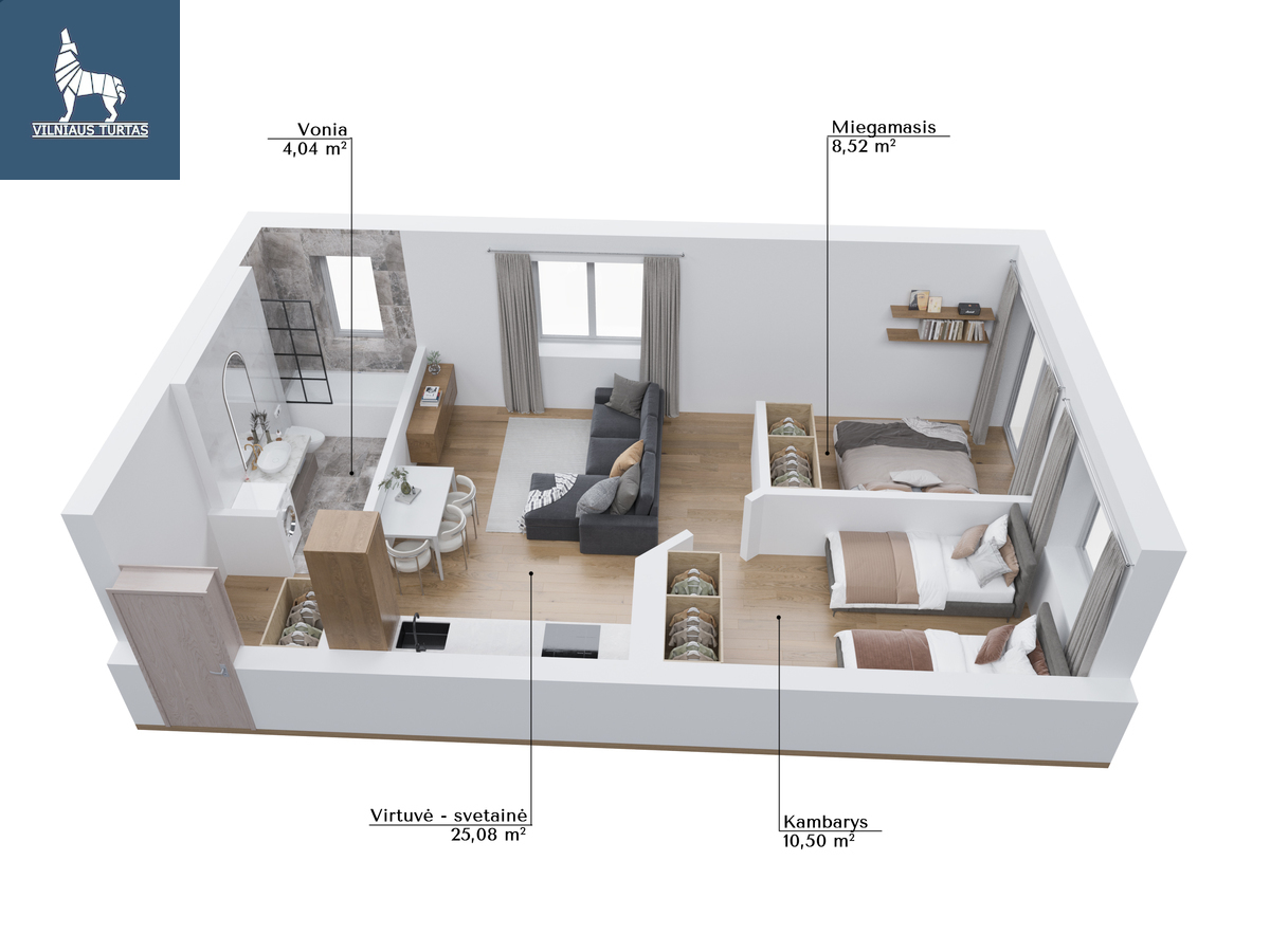 ✓ Funkcionalus išplanavimas – atskiras miegamasis ir papildomas kambarys