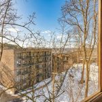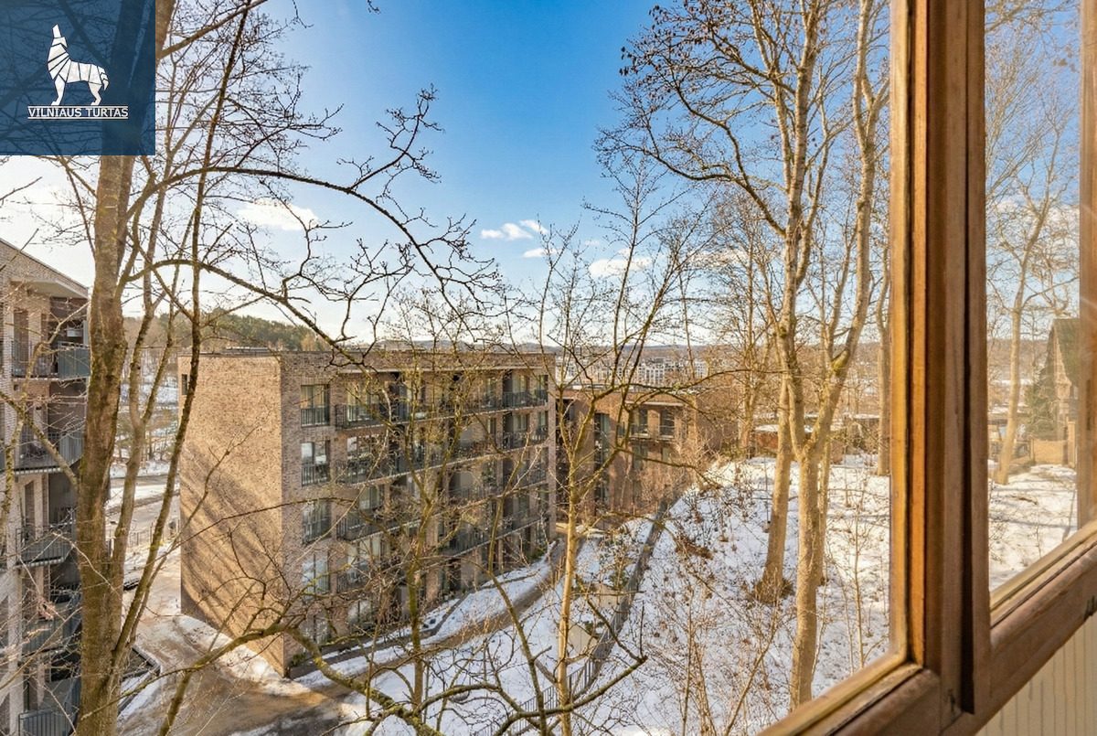 – langų kryptis – pietryčiai. Vaizdas į naują prestižinį gyvenamųjų namų kompleksą Polocko gatvėje, kuris yra žemiau ir niekaip neužstoja vaizdo į saulę, dangų ir miestą. Per langą matomi ir medžiai.