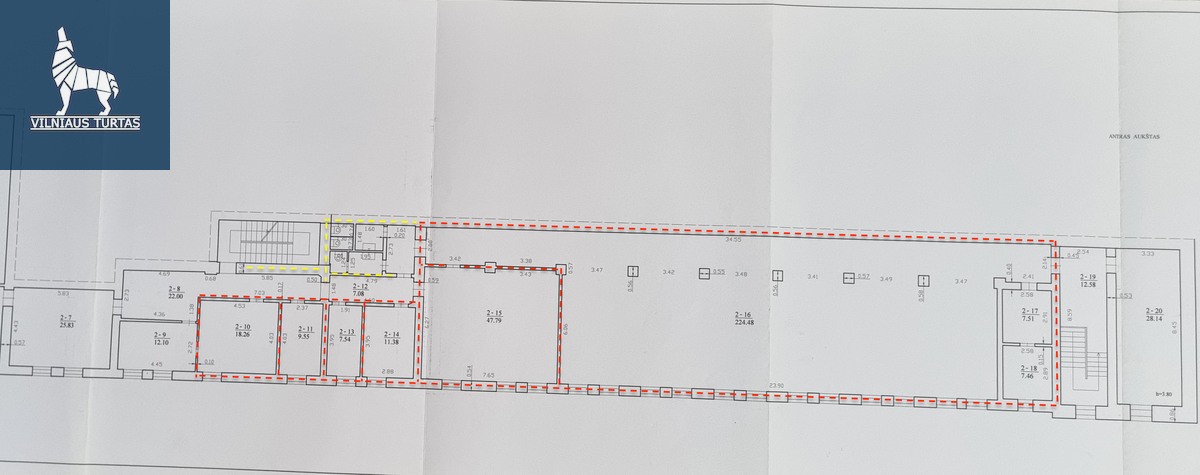 • Didesnės patalpos: 47,79 kv. m; 224,48 kv. m (cechas – galima dalinti į mažesnes patalpas); 7,51 kv. m; 7,46 kv. m