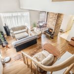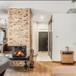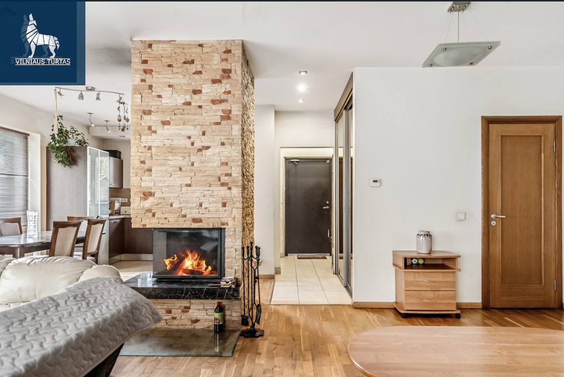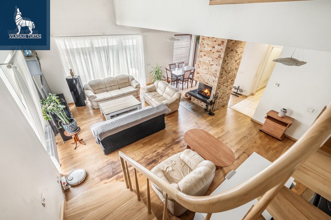 – Erdvi svetainė su aukštomis lubomis, židiniu ir išėjimu į terasą