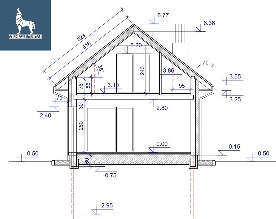 Stogo konstrukcijos įrengimas – gegnių medinių konstrukcijų įrengimas , gaminant elementus iš tašo, kai skerspjûvio plotas 45x245mm.+45x95mm. Plėvelinės izoliacijos įrengimas, naudojant difuzinę plėvelę RUUKI k1=1.05,k2=1.05.