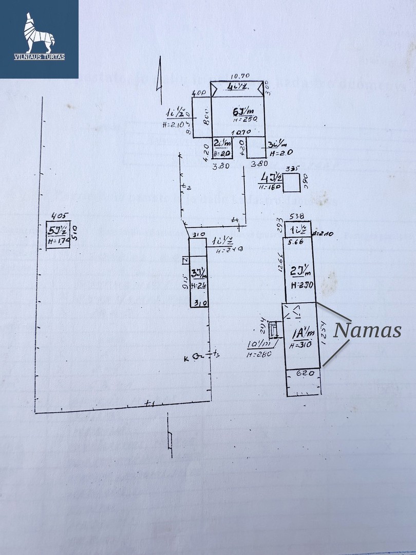 Vieno aukšto namas, bendras plotas 66.83 kv.m, rastinis, statybos metai 1940 m., kieme yra registruoti 3 ūkiniai pastatai, garažas, tvora, šulinys.